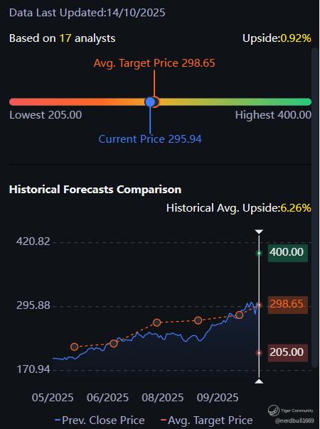 Based on 17 analysts from Tiger Brokers offering 12 month price targets for TSMC in the last 3 months. The average price target is $298.65 with a high forecast of $400.00 and a low forecast of $205.00. The average price target represents a 0.92% change from the last price of $295.94.
