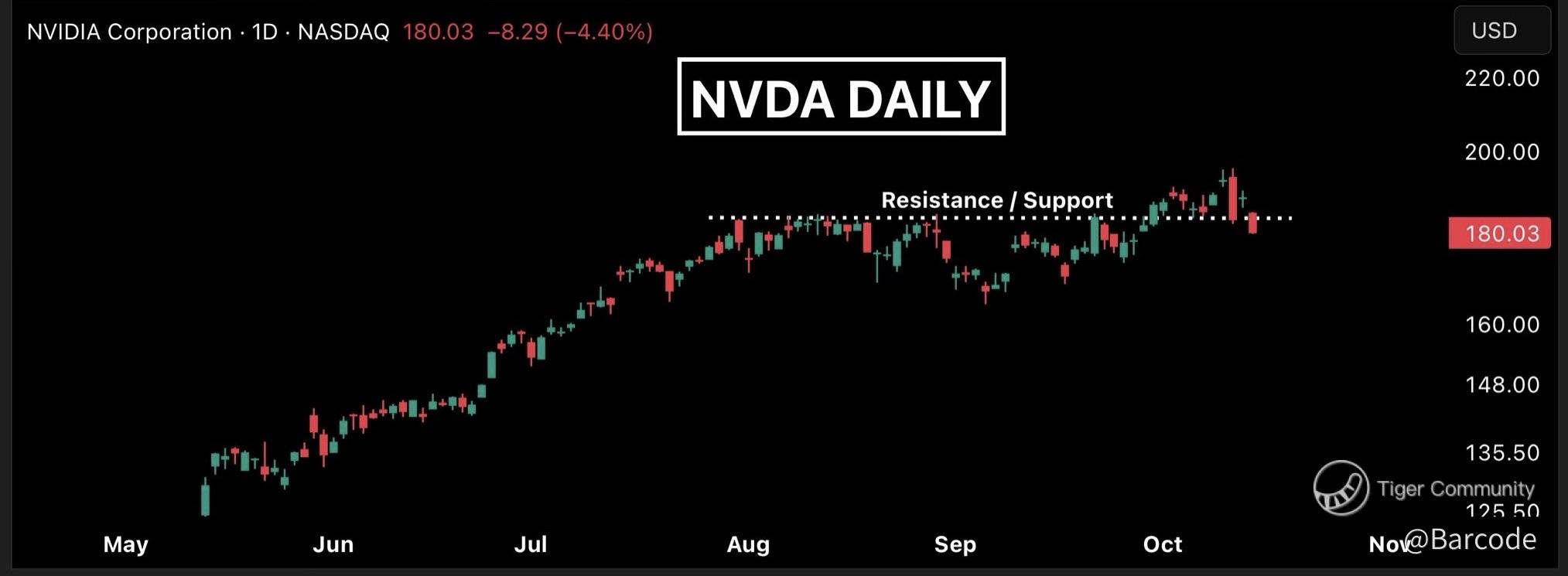 Nvidia printed a textbook bearish marubozu candle, breaking decisively below critical support with no intraday shadows. The clarity of the move reflects overwhelming sell-side conviction and capitulation from late buyers. Price closed at $180.03, down 4.4% after a 2.8% rally on Monday, erasing the bounce in a single, forceful session.