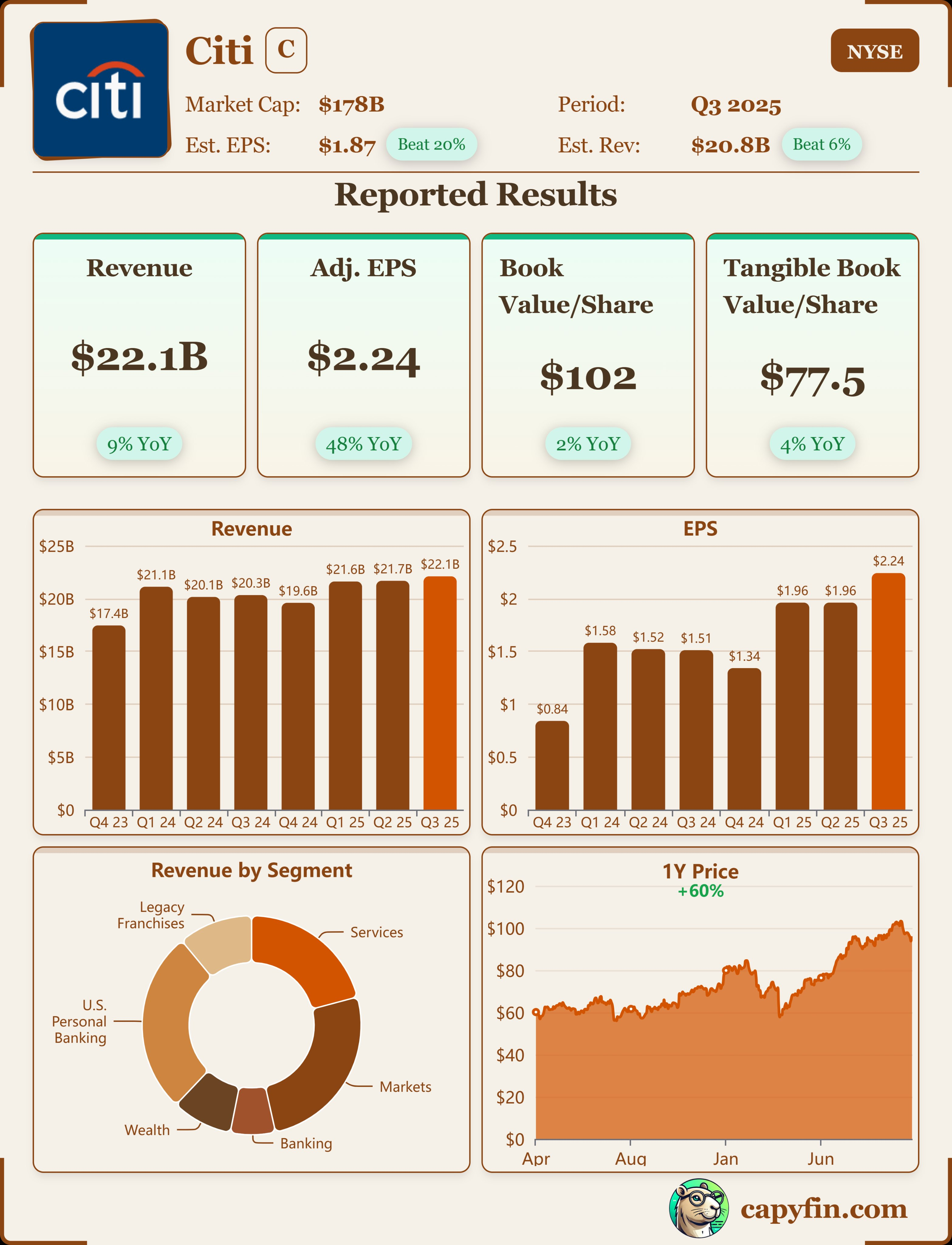 Citigroup trades at a P/E ratio of approximately 10 times, with its stock price rising 3.89% to $99.84. Compared to Bank of America (P/E 11 times), its transformation potential and AI-driven efficiency gains may be undervalued, particularly given the upside potential for its ROTCE target.