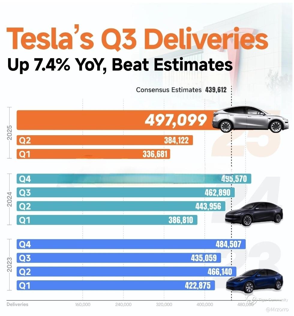 Telsa's vehicle deliveries in Q3 2025 reached 497,099, compared to 462,890 in Q3 2024, representing a growth rate of 7.4%, reversing the decline seen over the previous three quarters.