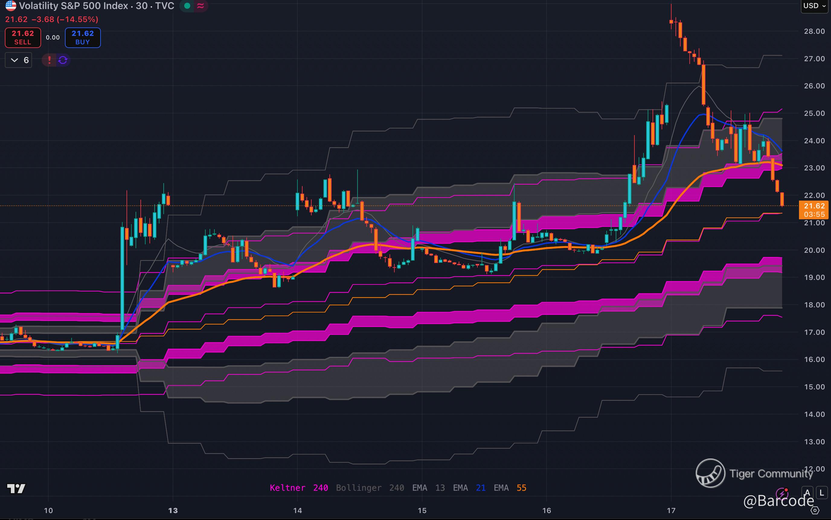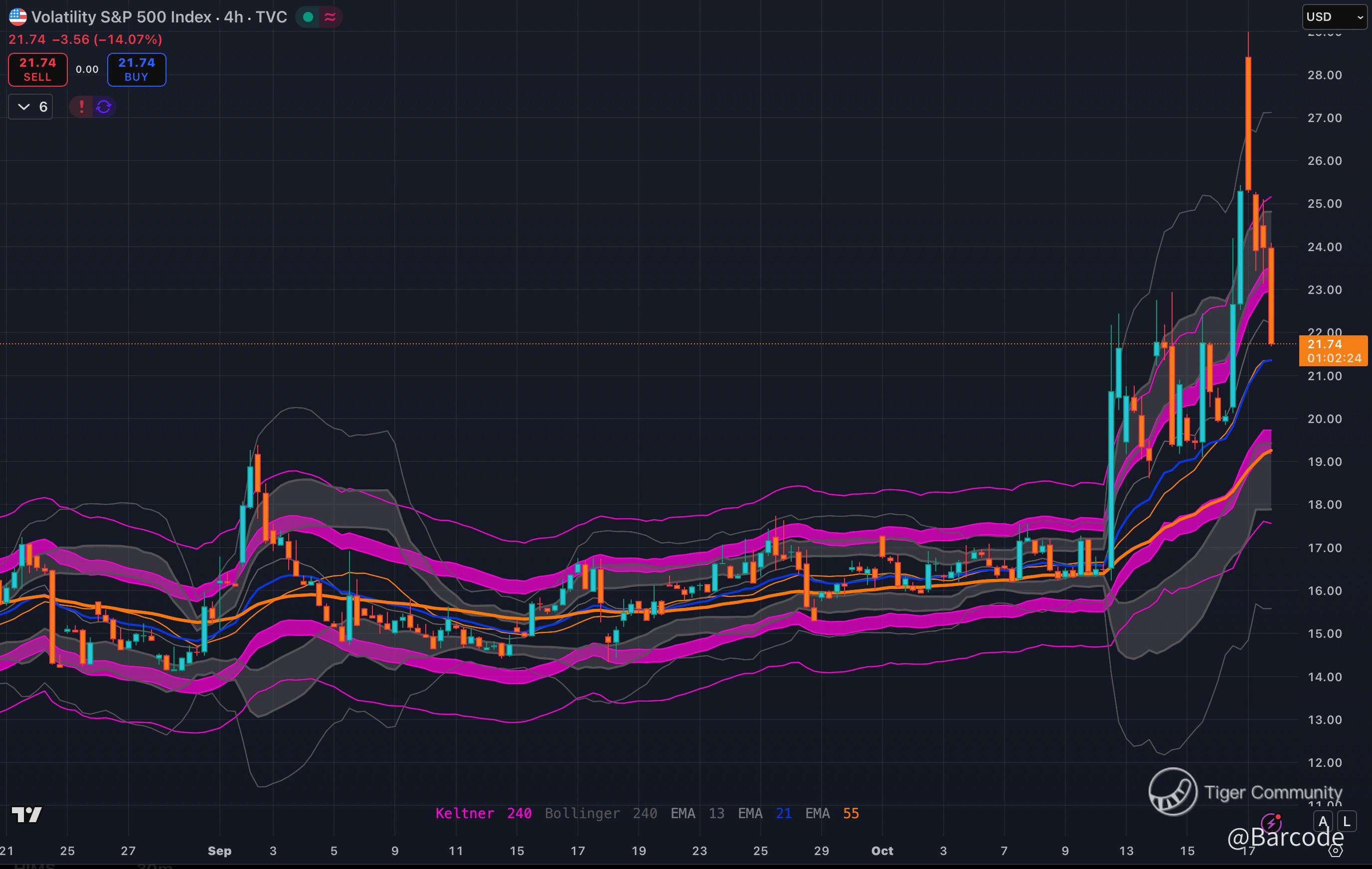 Iβm watching the same levels that have defined fear spikes for three years. VIXβs surge pierced both Keltner and Bollinger outer bands, then snapped right back inside; a textbook exhaustion signature. Price is now coiled around π΅ 21.7β22, a multi-timeframe support shelf built from recent EMA clusters and breakout retests. A sustained hold here can base for another volatility bump into earnings or geopolitical catalysts. A clean break lower would signal a reversion back toward π’ 18β19, re-establishing the low-vol regime.
