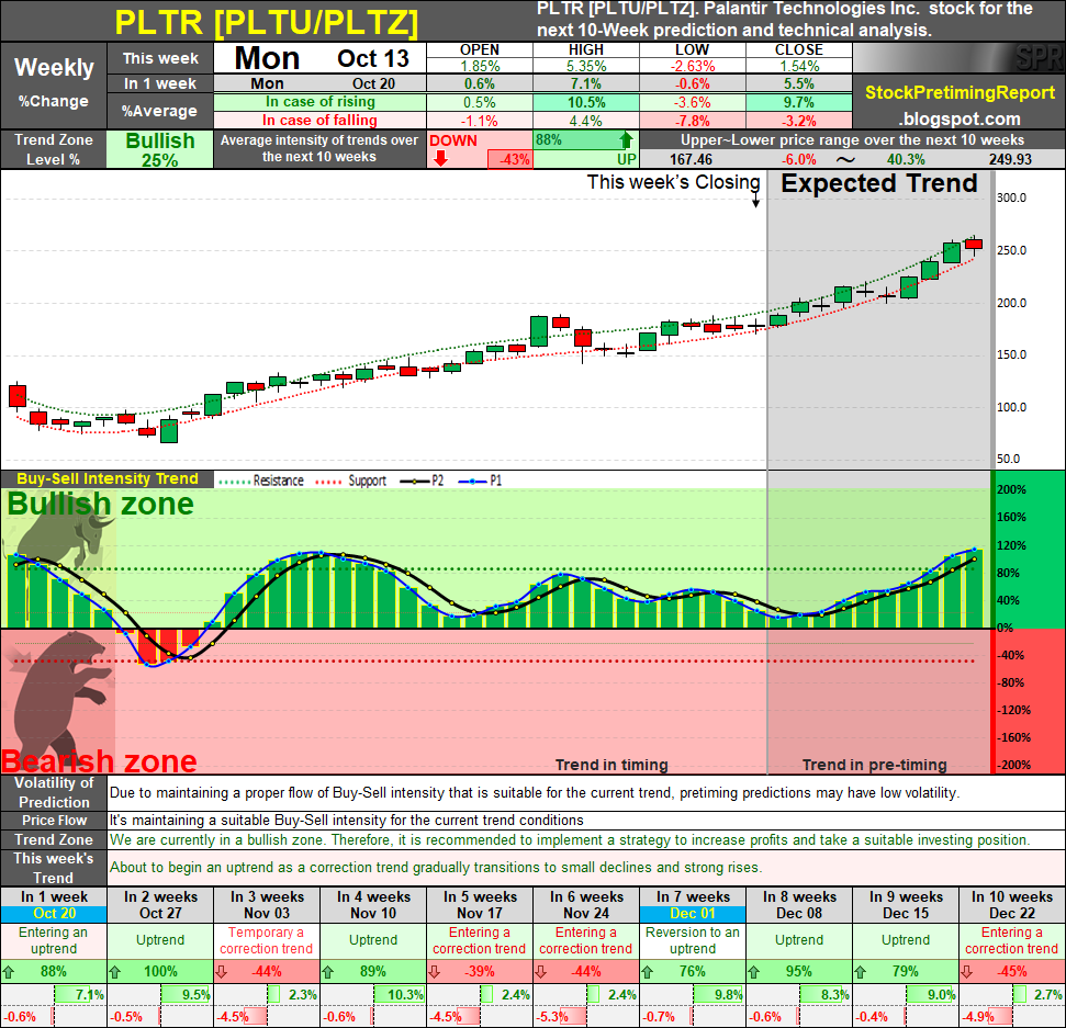 PLTR remains in a strong Bullish trend, with both long- and short-term strategies favoring accumulation and upward participation. The 10-week forecast anticipates a median gain of +17.1%, supported by robust uptrend dynamics. Investors should hold positions, strategically buy near support, and capitalize on continued upward momentum, while remaining attentive to minor pullbacks and market-driven fluctuations.