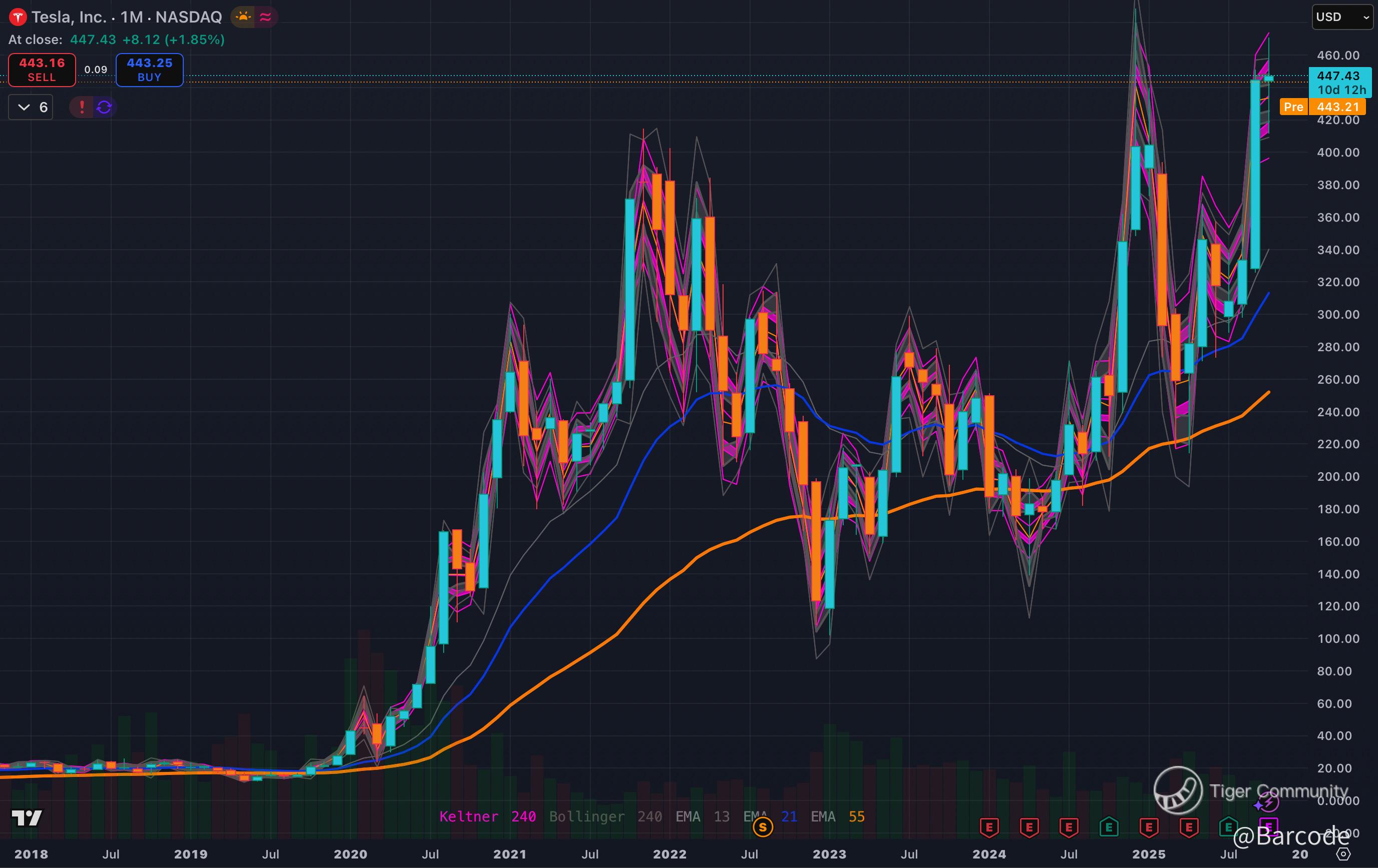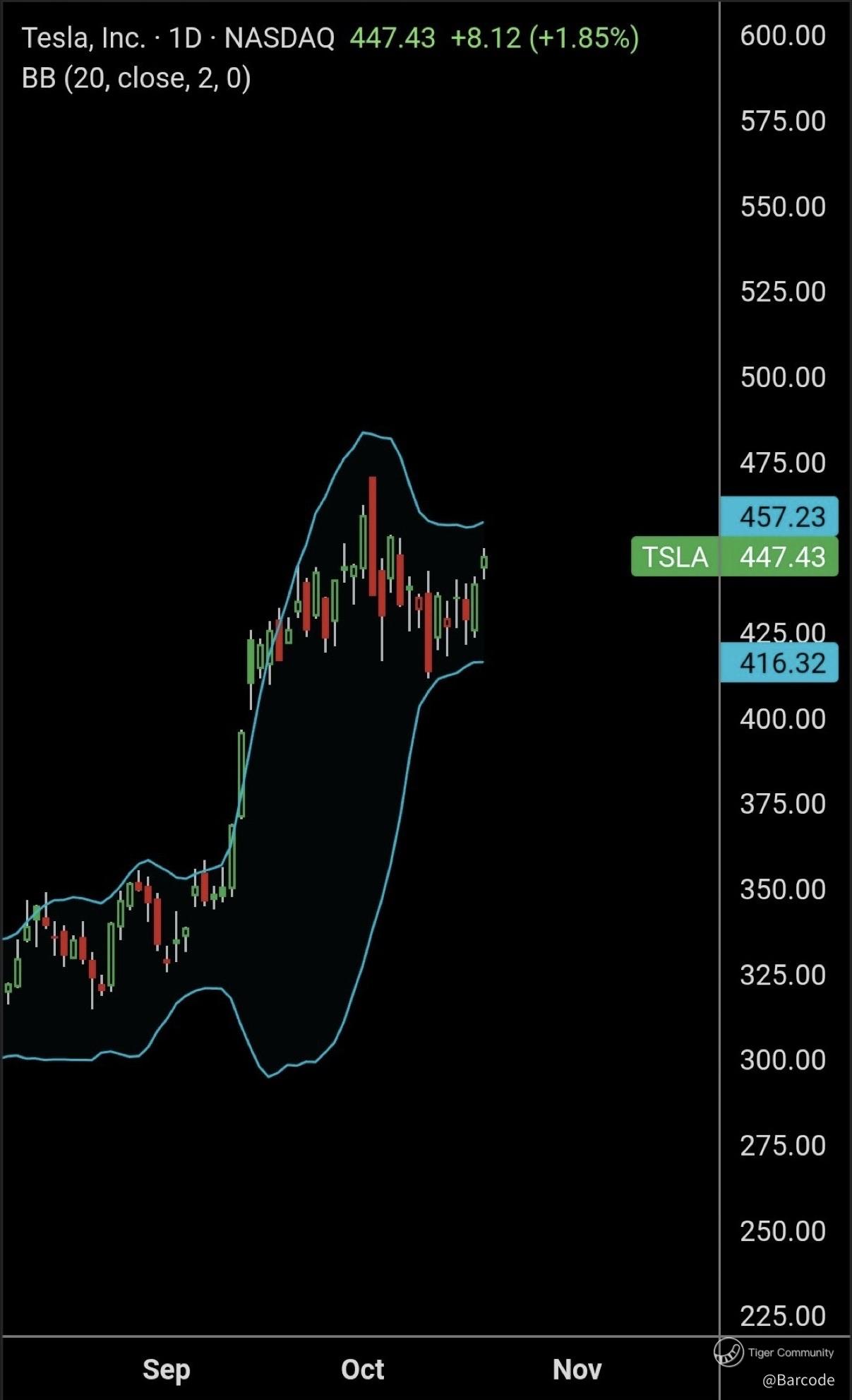 Tesla is coiling above its EMA with Bollinger compression intensifying. My read points to a potential 15 – 20 percent upside toward $525 if earnings confirm the breakout, supported by rising weekly volume and RSI divergence.