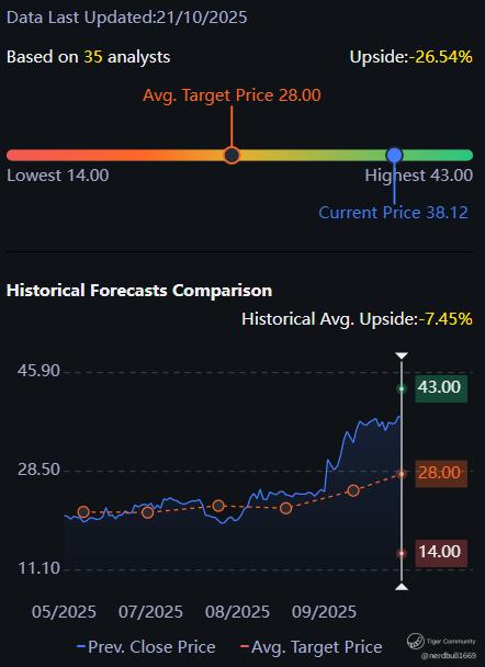 Based on 35 analysts from Tiger Brokers offering 12 month price targets for Intel in the last 3 months. The average price target is $28.00 with a high forecast of $43.00 and a low forecast of $14.00. The average price target represents a -26.54% change from the last price of $38.12.