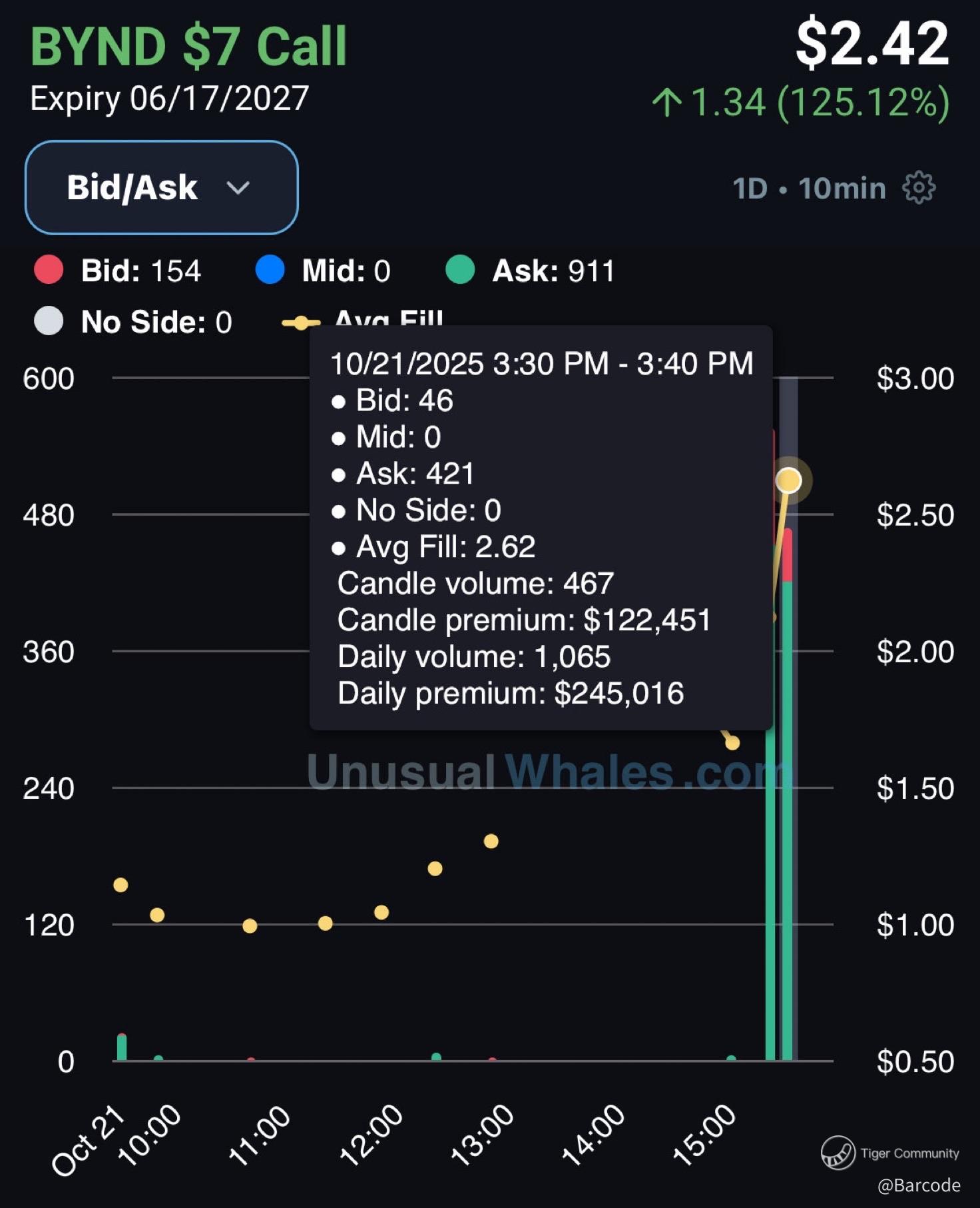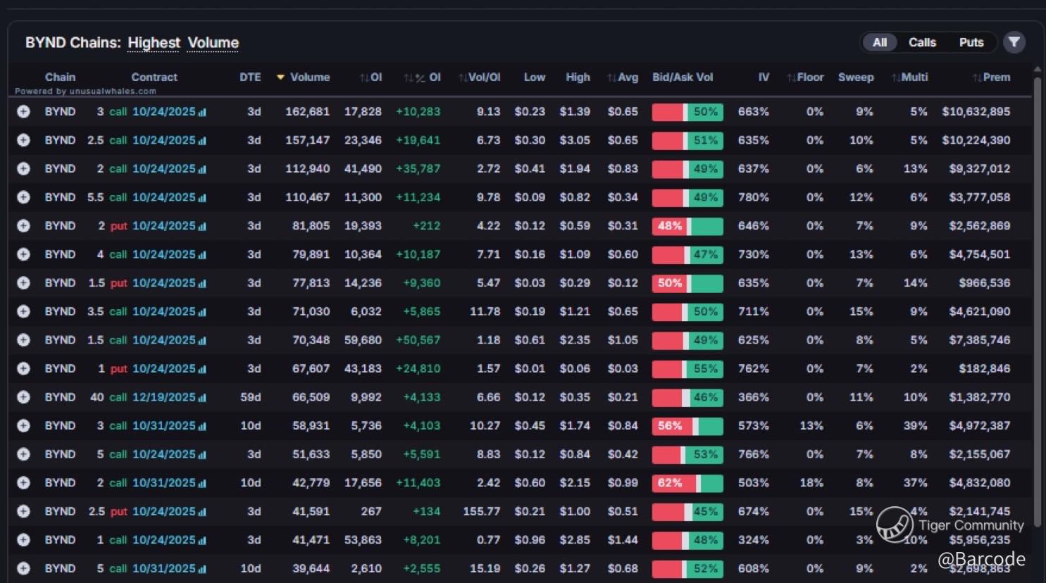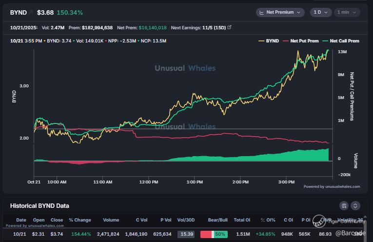 $BYND printed 2.53M contracts on 21Oct25; ~12Γ average; with calls ~75% of volume. That is classic squeeze fuel as dealers chase gamma on a vertical tape.