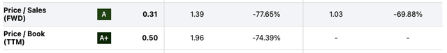 The price-to-book is sitting around 0.5, while competitors are around 1.6 to 2. The price-to-sales ratio is about 0.31 compared to 1.4.