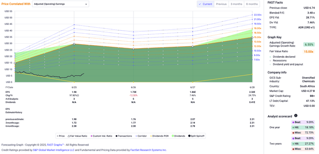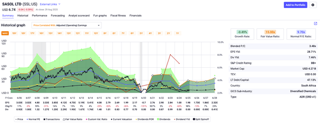 On raw multiples, Sasol looks mispriced to pessimism. The blended P/E is about 3.5, and the forward P/E is close to 3.6, while the median for the Materials sector is around 17.