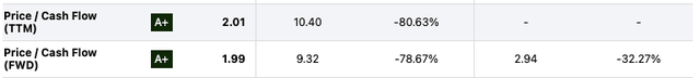 The price-to-cash-flow ratio is around 2, while the sector averages between 9 and 11.