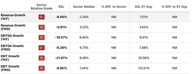 I think one of the issues is that Sasol’s growth picture is uneven, and the market doesn’t like that. Both revenue and EBITDA are lower than a year ago, and near-term forecasts suggest a slight decline.