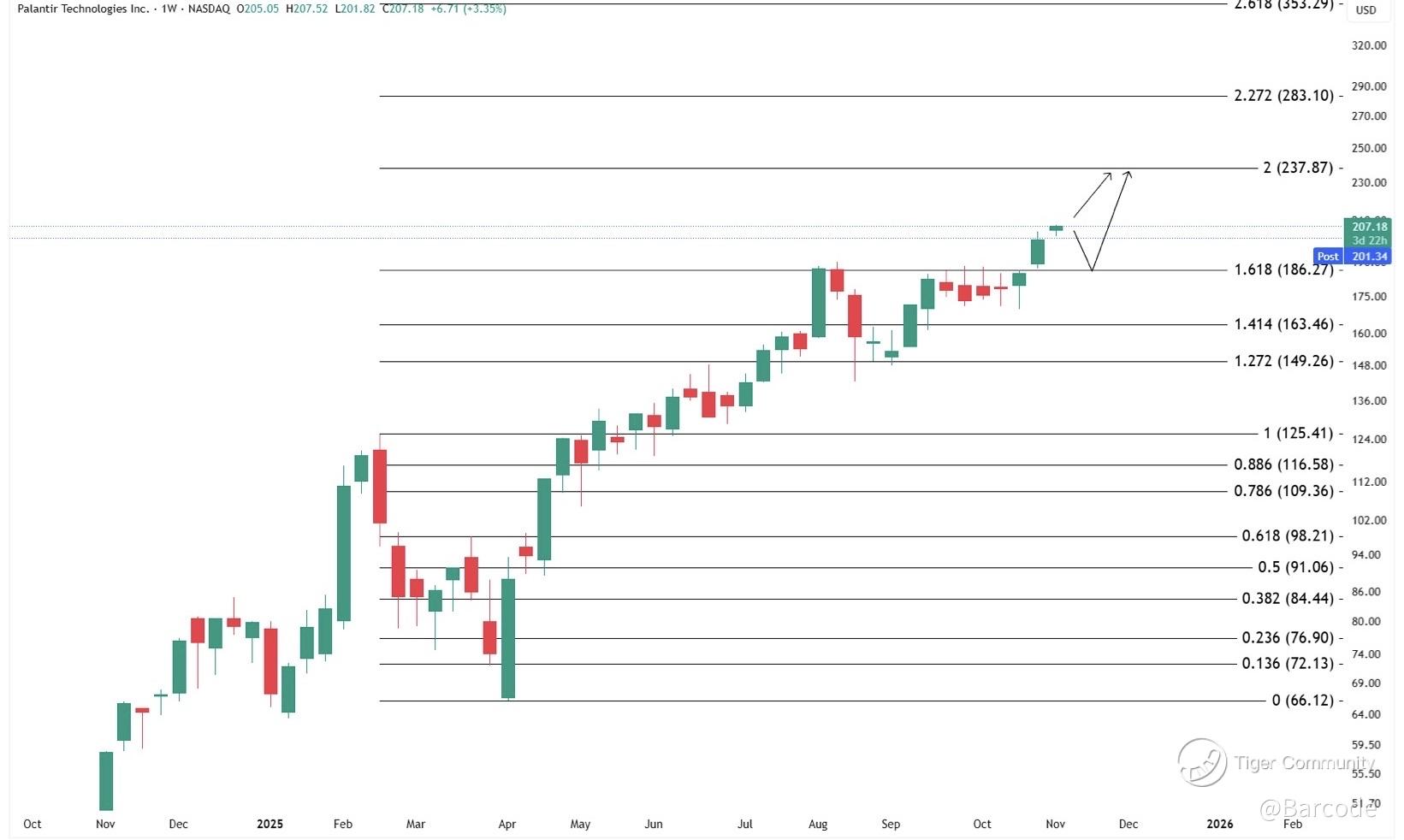 • On the weekly chart, PLTR clearly broke above the 1.618 log Fibonacci level at US$186.27, with the next stretch target at the 2.0 level of US$237.87.