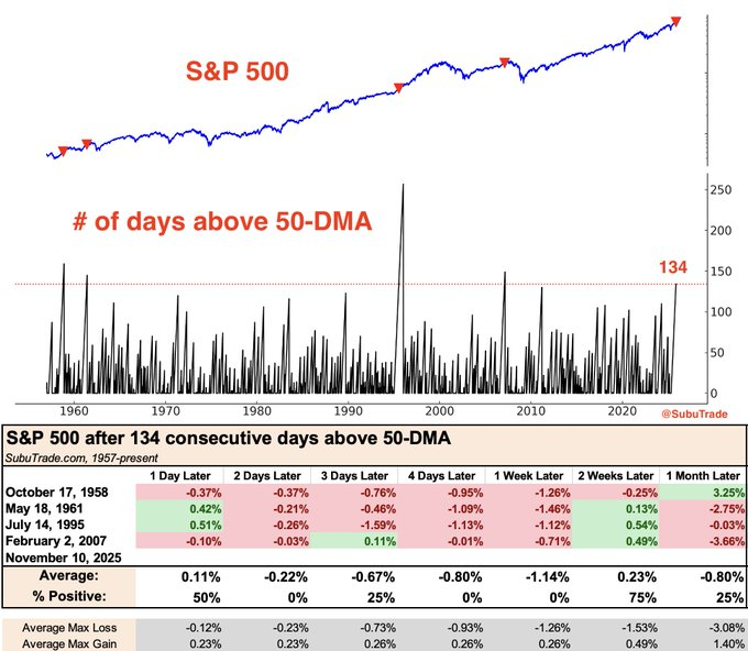 The $S&P 500(.SPX)$ has remained above its 50-day moving average for 134 straight days.