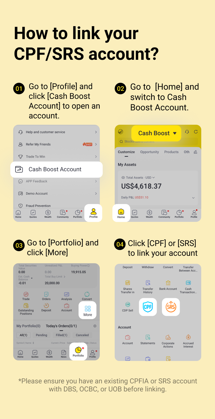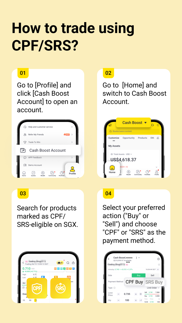 • No Limit Application Needed: Simply link your CPF/SRS account to automatically receive your limit and trade flexibly.