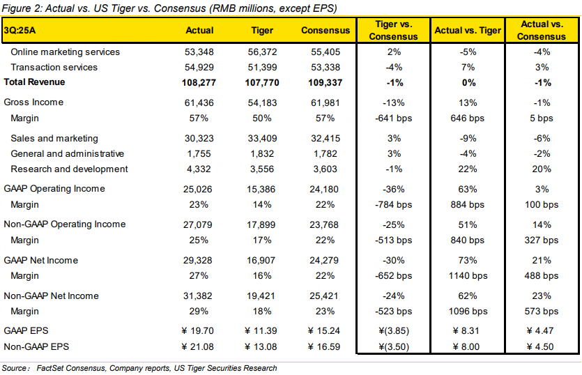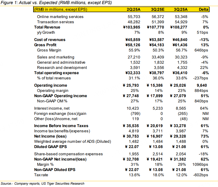 $PDD Holdings Inc(PDD)$ (HOLD) reported 3Q25 results showing a modest re-acceleration in revenue growth alongside stable profitability. The Tiger Research team notes that management reaffirmed its commitment to long-term ecosystem investments and cautioned that quarterly performance will remain volatile. Total revenue grew 9% YoY to RMB 108.3bn, an improvement from 7% YoY in 2Q25, but still below the high-growth levels seen in prior years. Management highlighted that intensified competition, greater merchant support, and external uncertainties are weighing on monetization, and refrained from providing quantitative guidance.