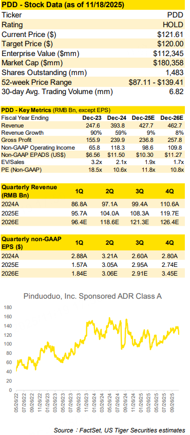 The Tiger Research team maintains a HOLD rating with a $120 price target, slightly increasing the 4Q total revenue estimate +2%, while decreasing 4Q non-GAAP EBIT by 10%.