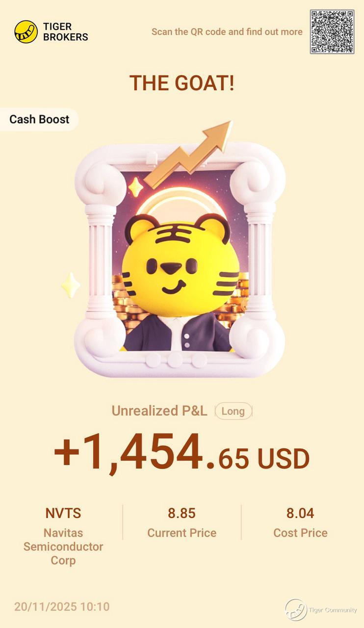 $Navitas Semiconductor Corp(NVTS)$ Caught a nice wave with NVDA for some profits! NVTS rode the momentum as a partner, quieting the bubble fears. Perfectly timed with the Contra688 promo – using the free cash to double down. Ready for the next push!