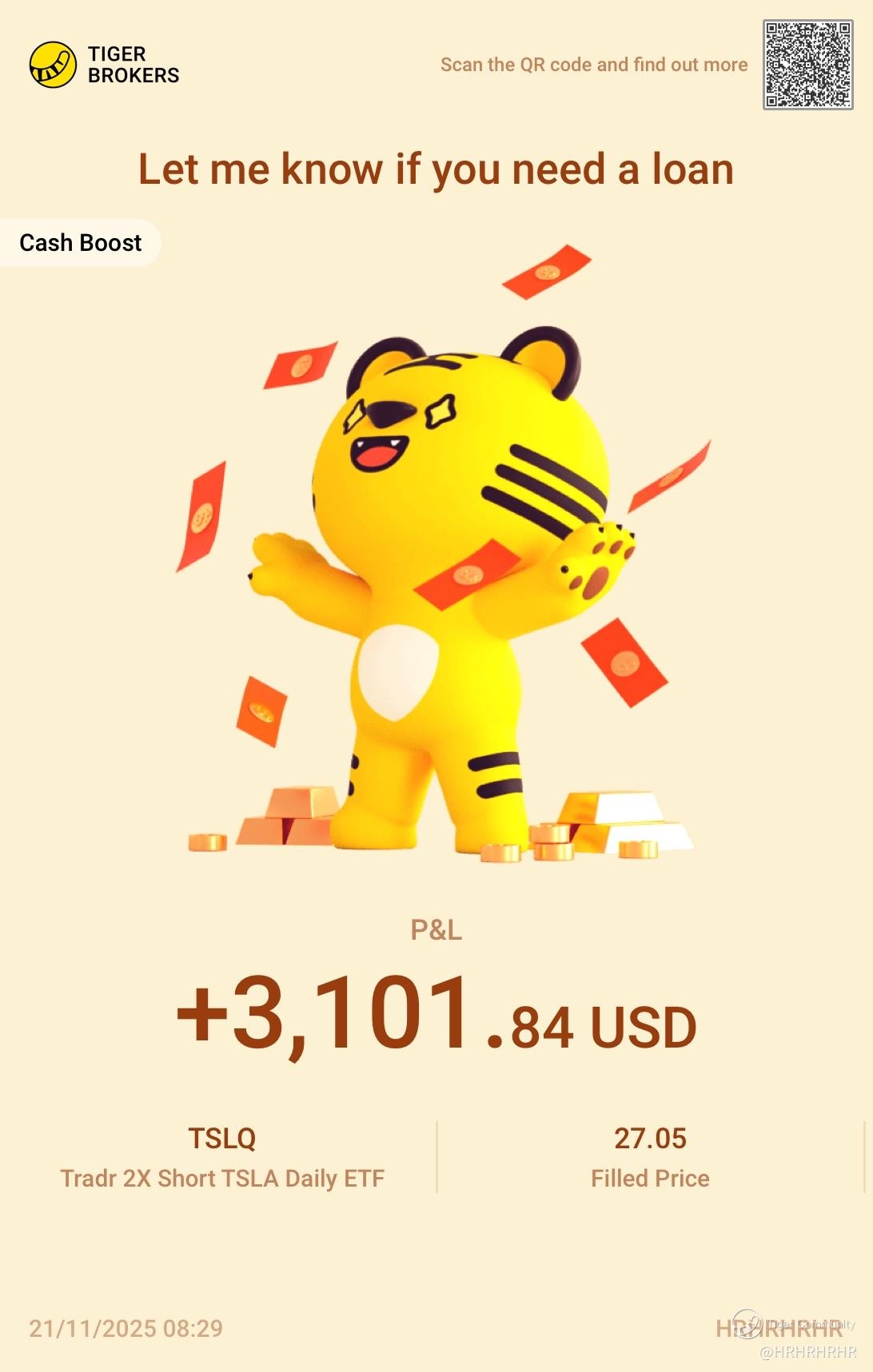 And we are also happy to see @HRHRHRHR made a profit of USD 3101 trading $Tesla Motors(TSLA)$ through CBA.