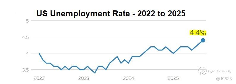 US unemployment rate rose to 4.4% for the month, up from August 2025’s 4.3%.