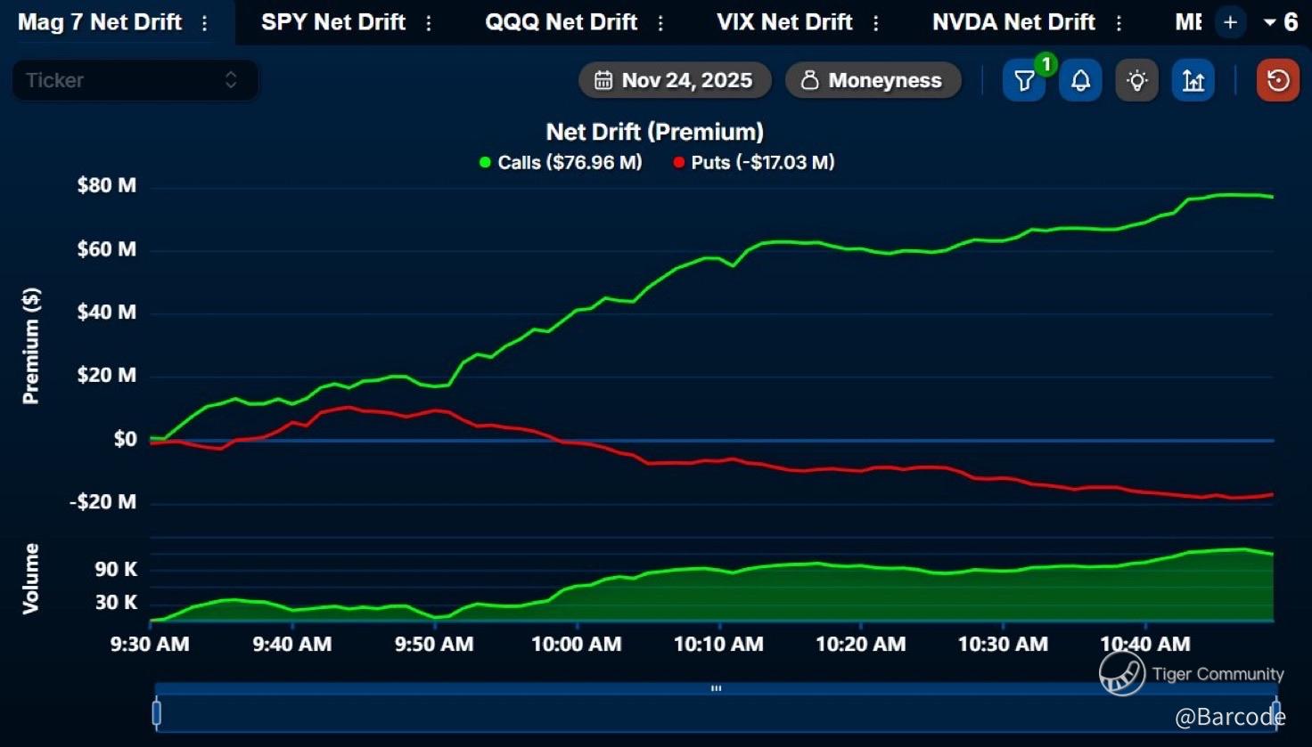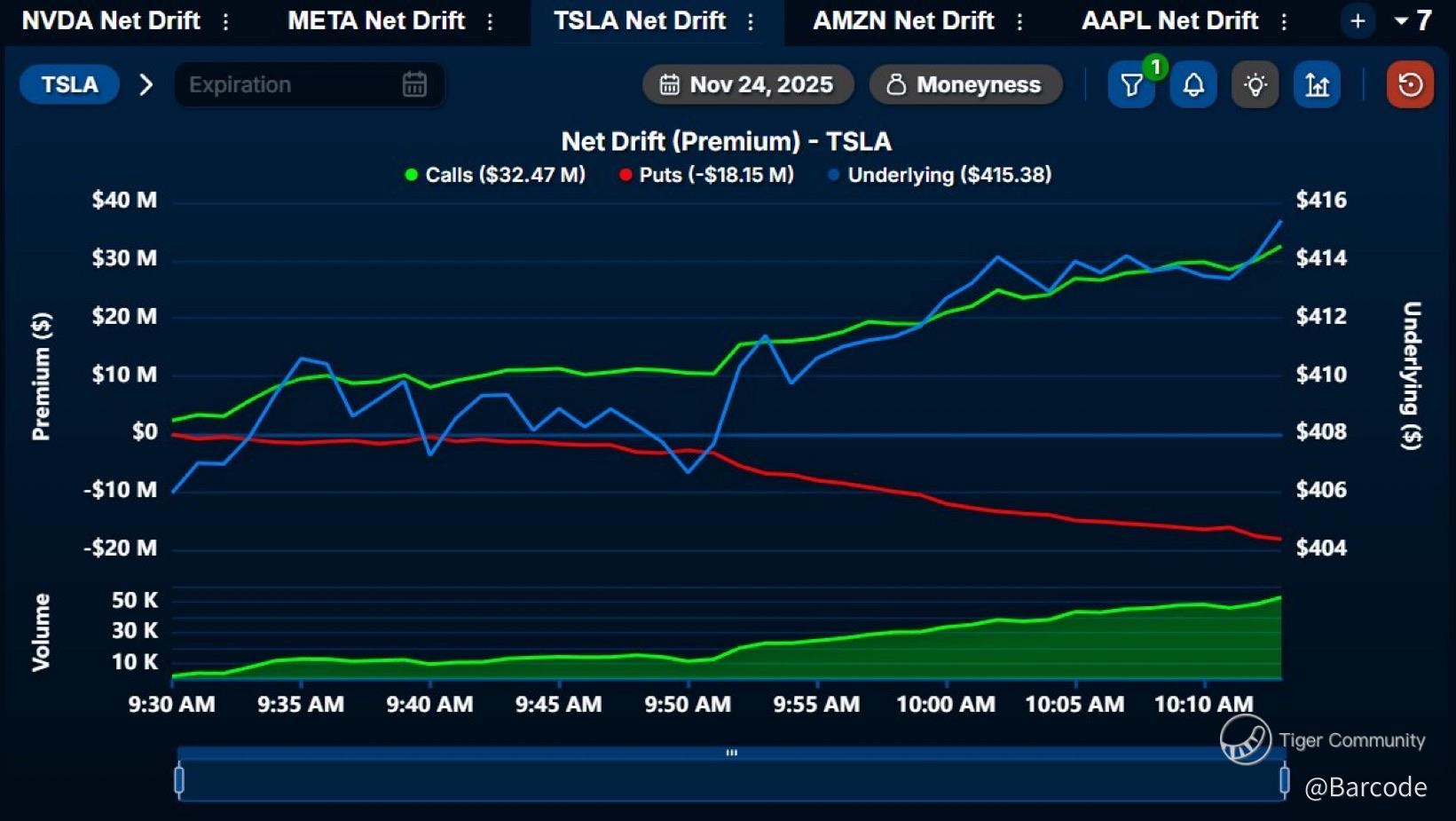 $Roundhill Magnificent Seven ETF(MAGS)$ $Tesla Motors(TSLA)$ $Alphabet(GOOGL)$ π₯ Massive Mag 7 call flow absolutely crushed it at $76.96M while puts bled minus $17.03M, a pure liquidity flush that snapped rotation straight back into the bullish trend. $TSLA led with $32.47M in long calls and heavy net put selling at minus $18.15M, real momentum driving the underlying straight toward $415 resistance with structure tightening. Iβm still holding my oversized $GOOGL long from $315.10, now +61.35%. Up 57.19% YTD and 109.5% since 08Apr25, levels and flow both scream continuation higher π