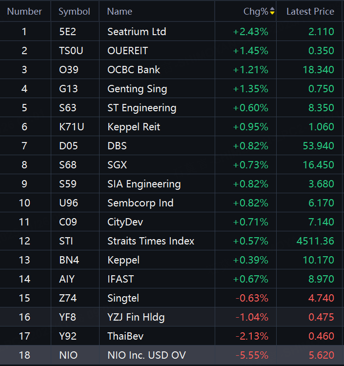 SG Morning Call | STI Rises 0.6%; Seatrium up over 2%; OUEREIT, OCBC Bank, Genting Sing up over 1%; DBS, Keppel Reit up Nearly 1%; NIO Down over 5%; ThaiBev Down over 2%.