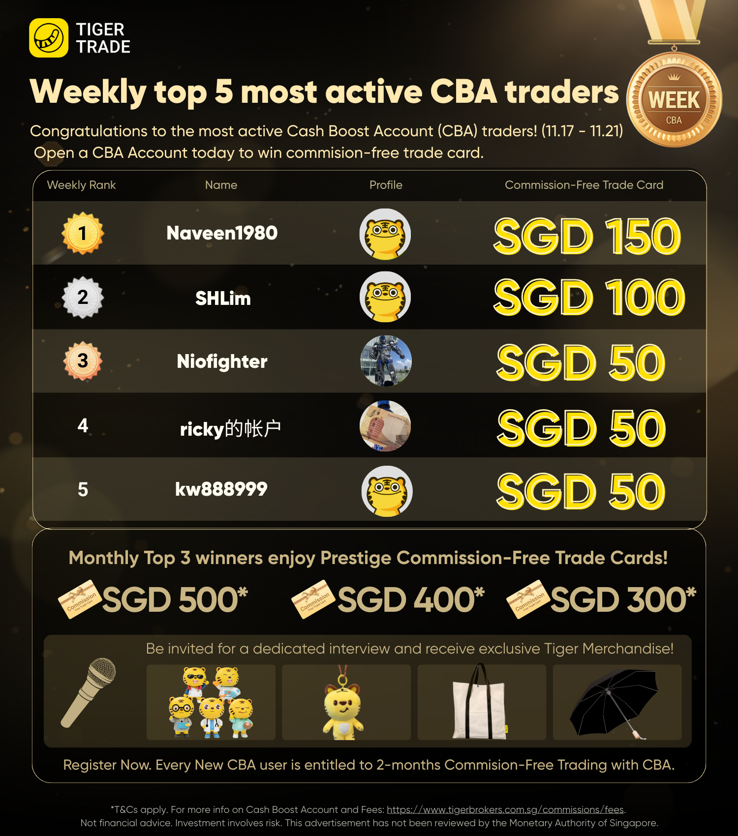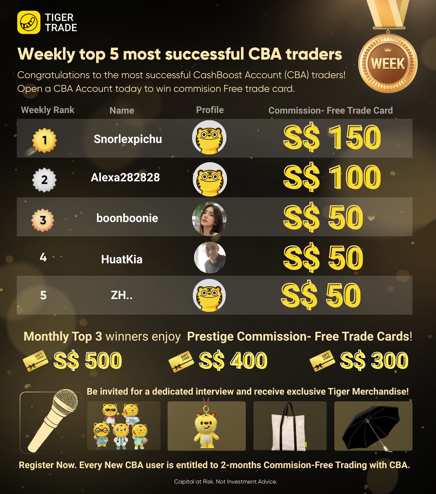 🏦 Open a CBA today and enjoy privileges of up to SGD 20,000 in trading limit with 0 commission. Trade SG, HK, US stocks as well as ETFs unlimitedly!