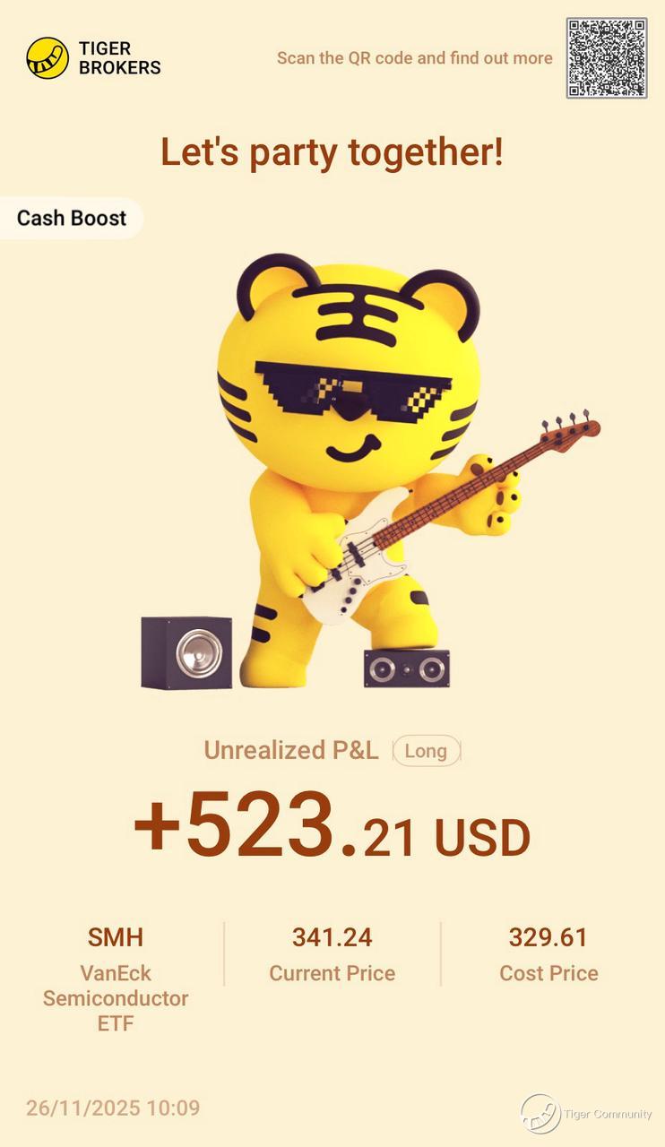 $VanEck Semiconductor ETF(SMH)$ play worked out! AI wave driving chip demand, caught the sector rotation perfectly. Holding for now~ Kicking myself for missing Contra688 - those vouchers would've been ideal. Next promo I'm not missing out!