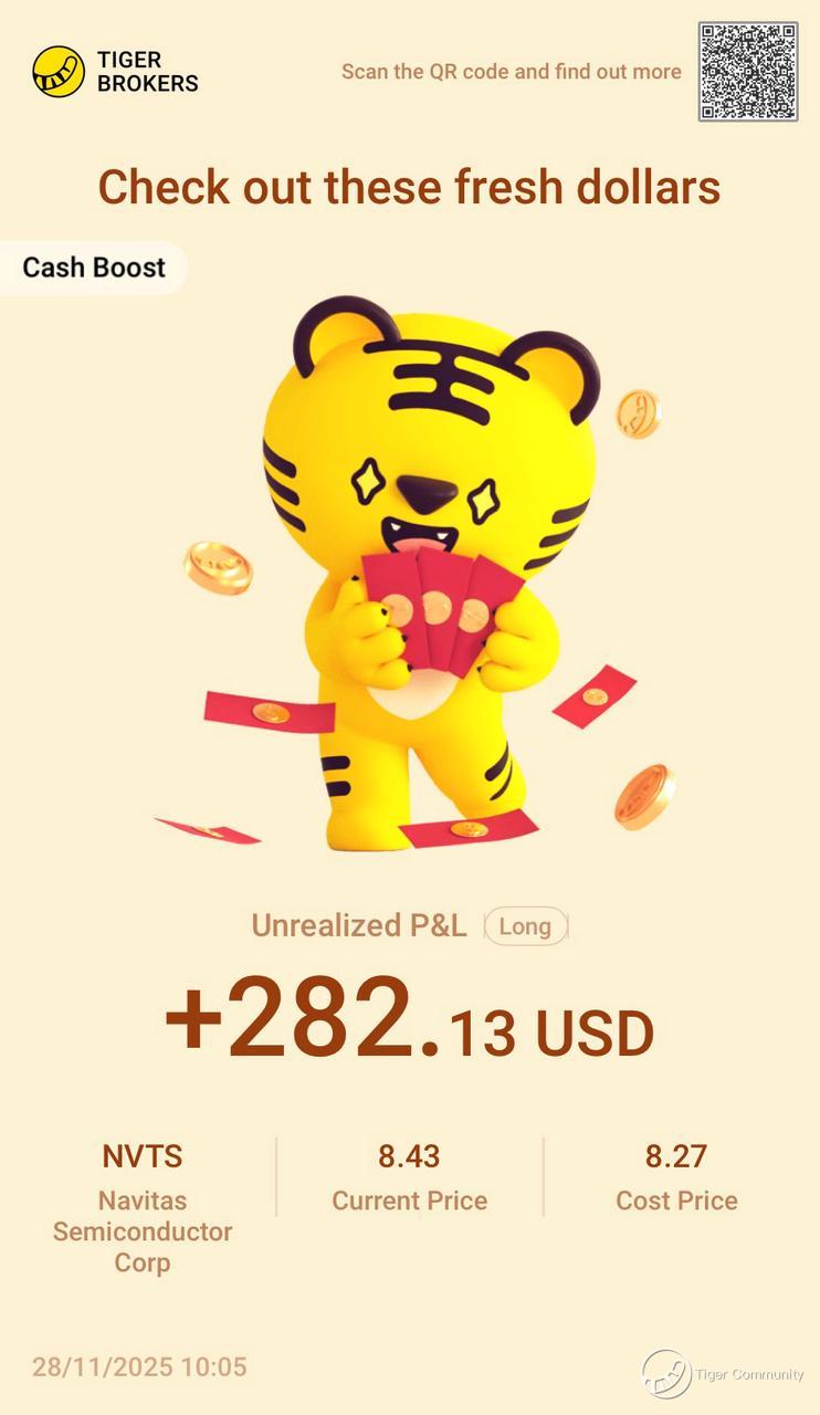 $Navitas Semiconductor Corp(NVTS)$ Patience pays off! Saw NVTS's potential since it started moving last October. With solid drivers in AI data centers and auto chips, the fundamentals are strong. Held tight without fear, and scoring the Contra688 bonus was the cherry on top - bullish for the next leg up!