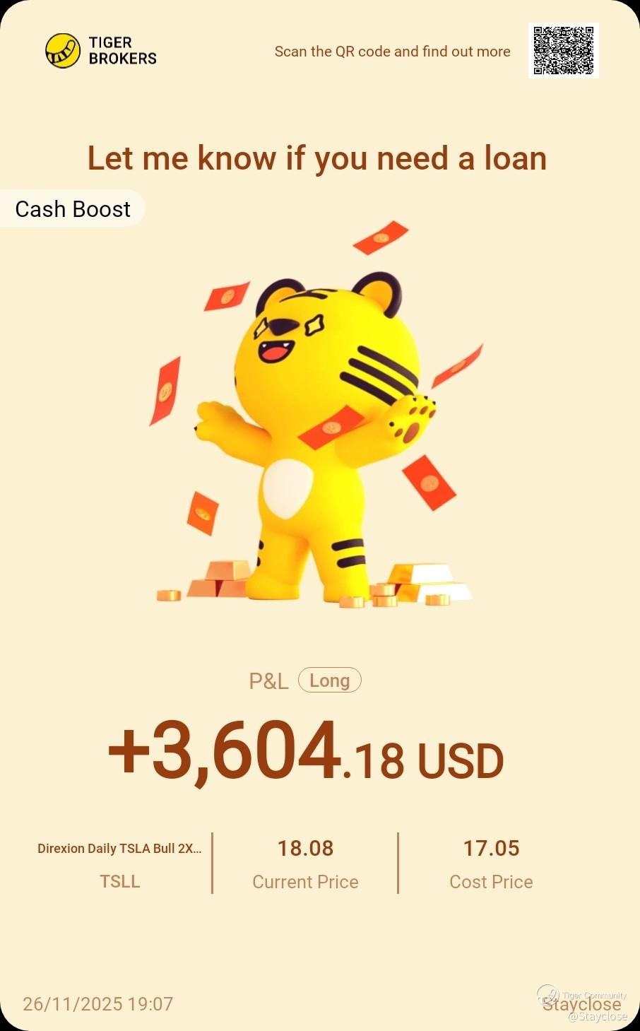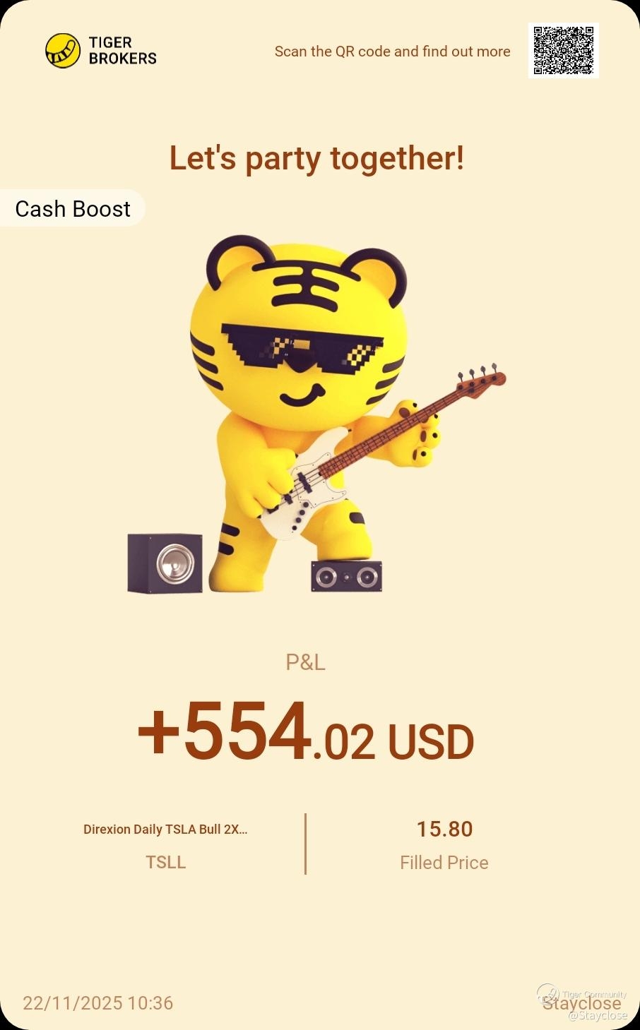 And we are also happy to see @Stayclose made a profit of USD 2359 trading $Direxion Daily TSLA Bull 2X Shares(TSLL)$ through CBA.