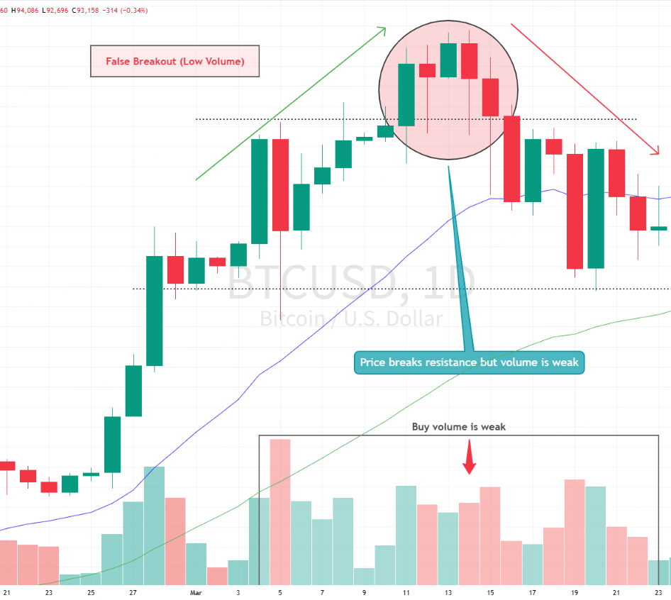 Price breaks above resistance but volume is weak: The move looks real at first, but lacks the participation needed to sustain it.