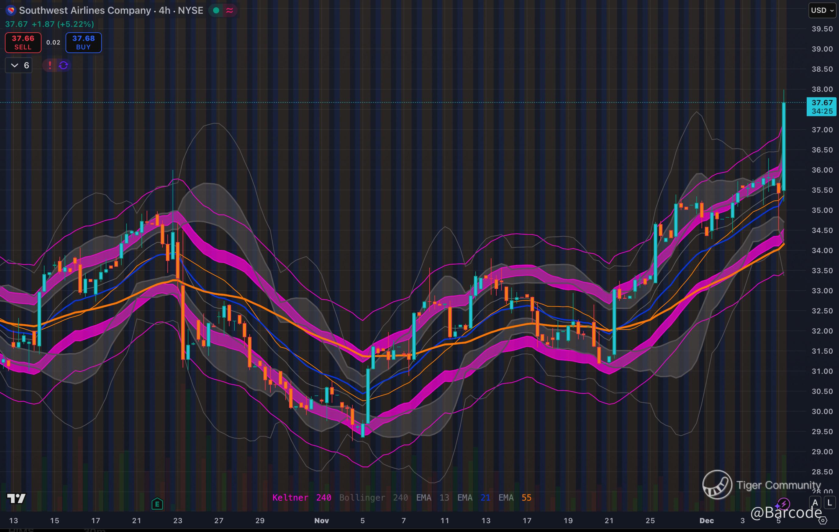 I am watching $LUV smash straight through 4h resistance, flag break confirmed, gap filled clean, volatility bands expanding fast. Volume just flipped hard bullish and I am loving it. Flow rotating aggressively back into the trend on rising liquidity. Shares up 5% after shutdown scare. Bookings recovered strong. EBIT cut to $500M from $600M to $800M with only a $100M to $300M revenue dent. Delta copped a $200M hit too so sentiment was overly washed out. Big Money stepping back in heavy, bear trap sprung, structure aligned perfectly for continuation πβοΈ
