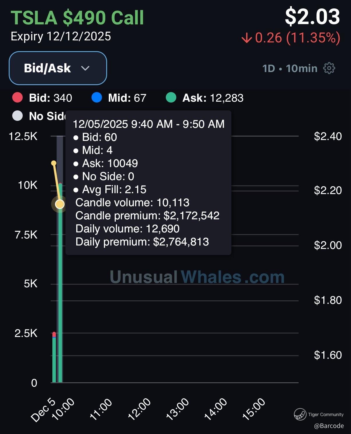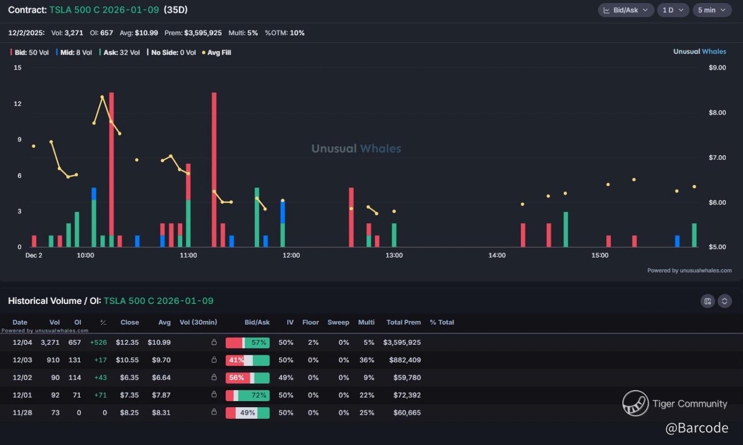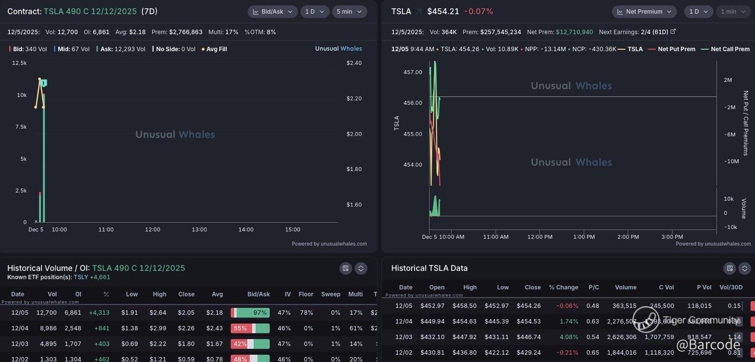 Options flow has been punchy. I saw roughly $2.7M in premium flow into 7DTE $TSLA calls and a notable $2.1M call buyer pressing upside. The Unusual Whales reads on the $490C expiring 12 Dec show around 12,700 contracts traded with more than 10,000 in a single candle and over $2.1M of premium in that window, roughly $2.76M across the day. Further out, the $500C into early January 2026 traded more than 3,200 contracts with total premium comfortably above $3.5M and open interest climbing. Net call premium for the day was strongly positive. That is not a guarantee of direction, yet it is very consistent with a squeeze regime rather than a complacent drift.