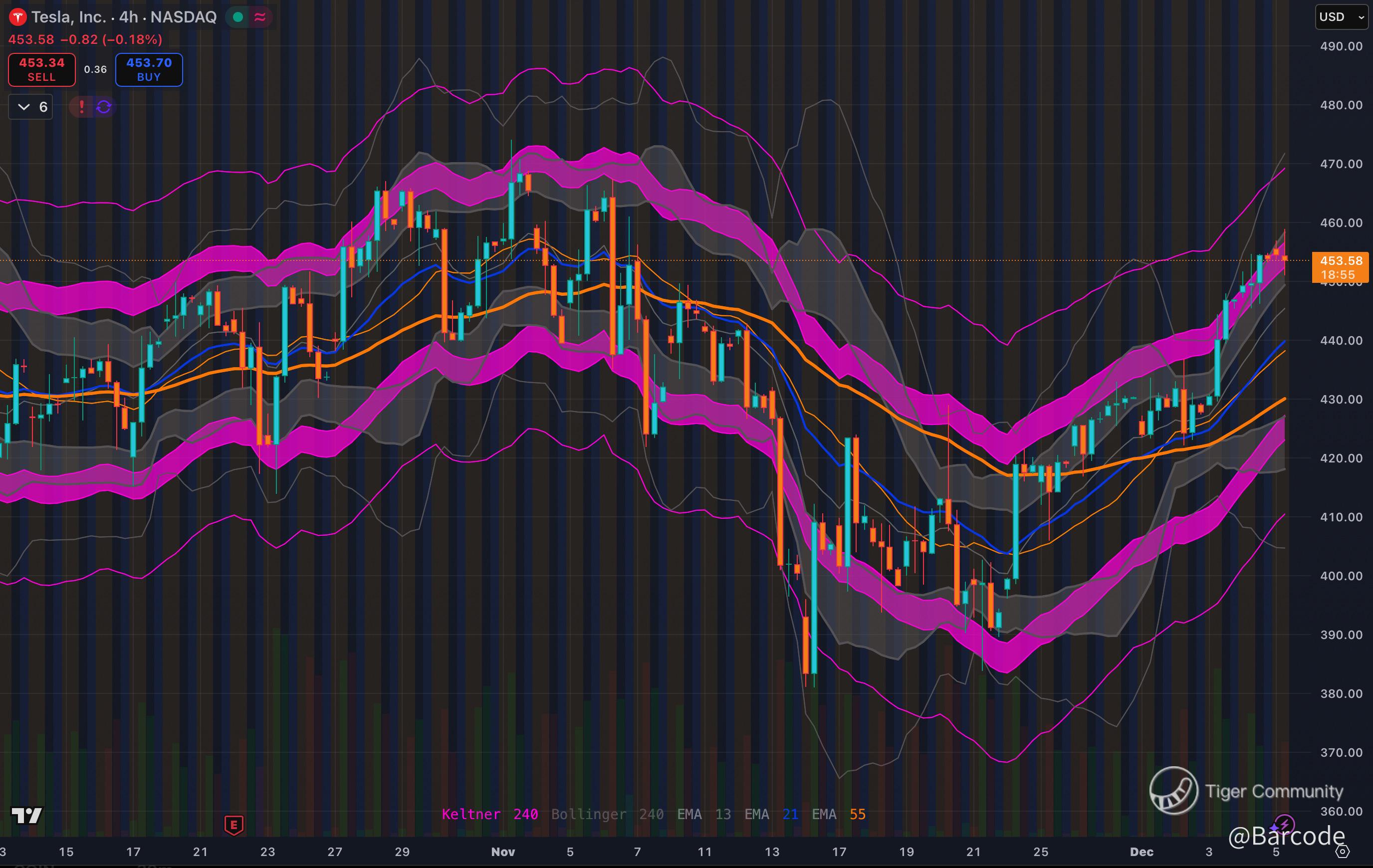 I am impressed with how $TSLA defended the $9 bounce zone and converted it into a clean momentum ramp. Price is sitting around $453 to $454 after printing a new daily high and pressing directly into the upper Keltner and Bollinger bands on the 4H chart. That tells me we are in expansion rather than mean reversion. On the 30m view the staircase structure is very clear, each intraday dip bought near the rising short EMAs, with the 55 EMA acting as dynamic trend support.