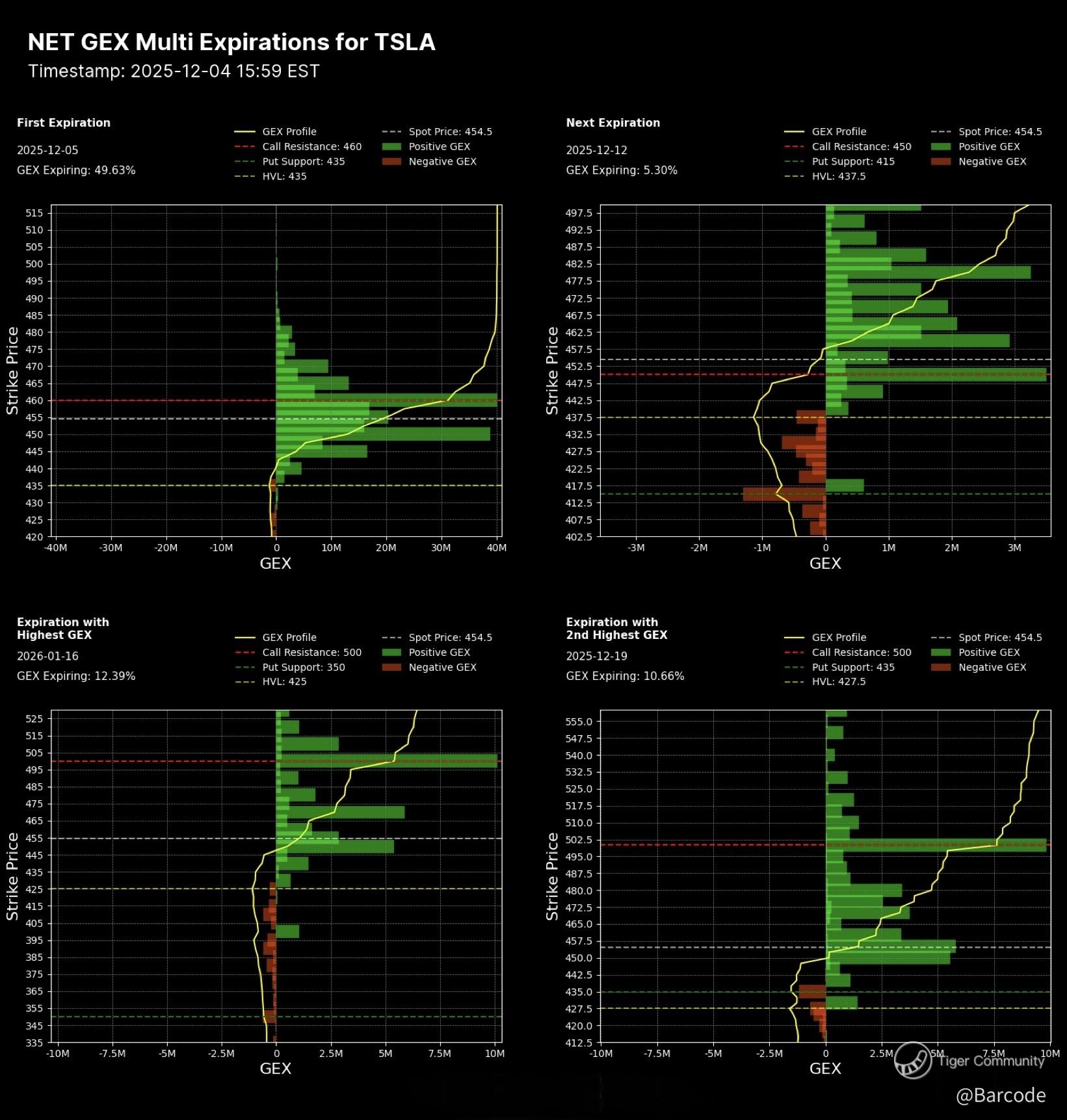 Dealer positioning continues to lean supportive. The multi expiration GEX map for $TSLA shows mostly positive GEX across the key expiries. Positive GEX usually means dealer hedging acts as a volatility dampener, absorbing shocks on both sides and encouraging a more controlled grind higher rather than wild swings. The nearest term boards show call resistance up around $460 and $500, with put support stepping in near the mid $430s, which lines up nicely with the band structure on the chart.