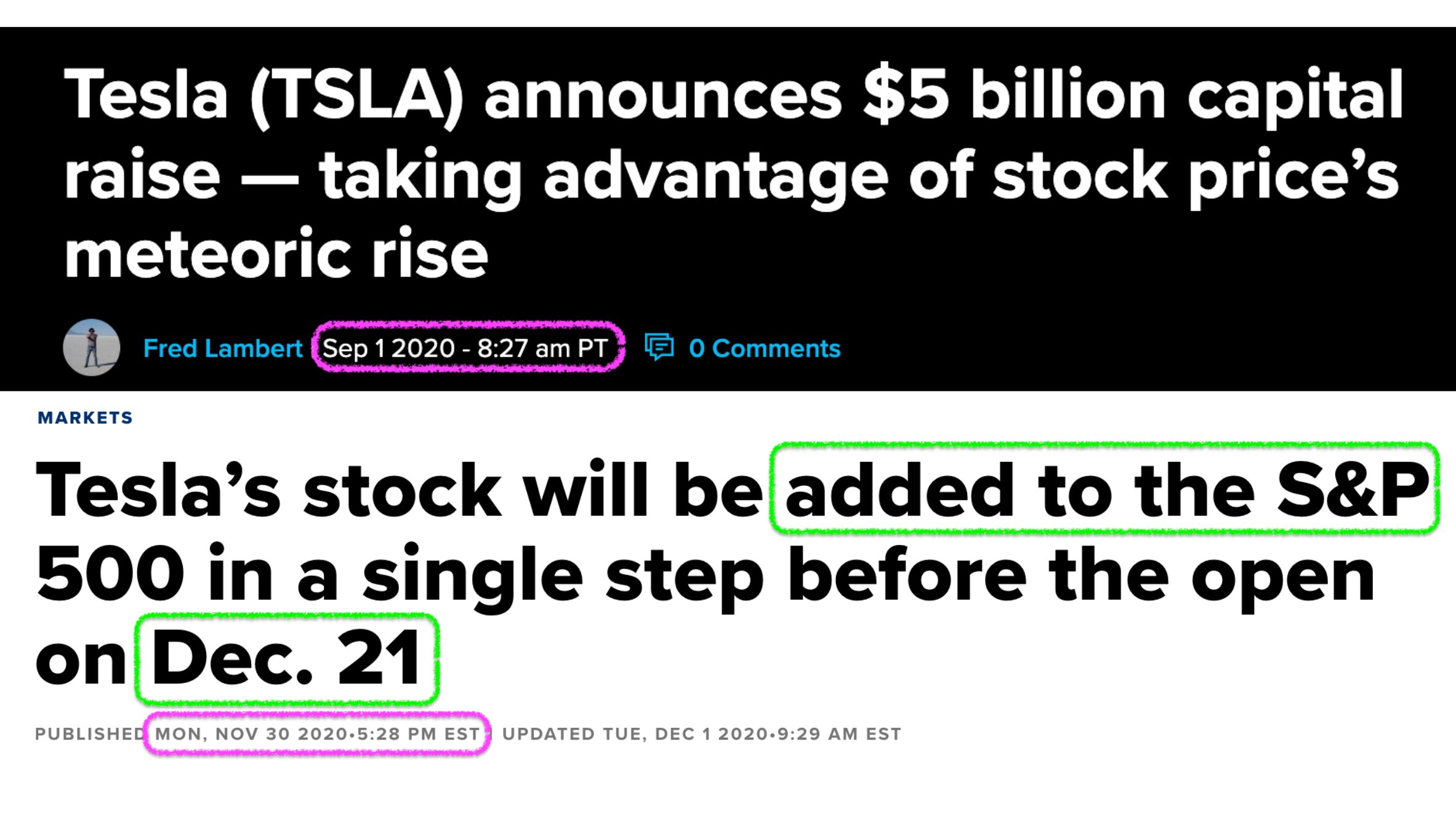 When $Tesla Motors(TSLA)$ joined the S&P, they had two offerings in three months...one was 8 weeks before inclusion news, one was just days before the inclusion news.
