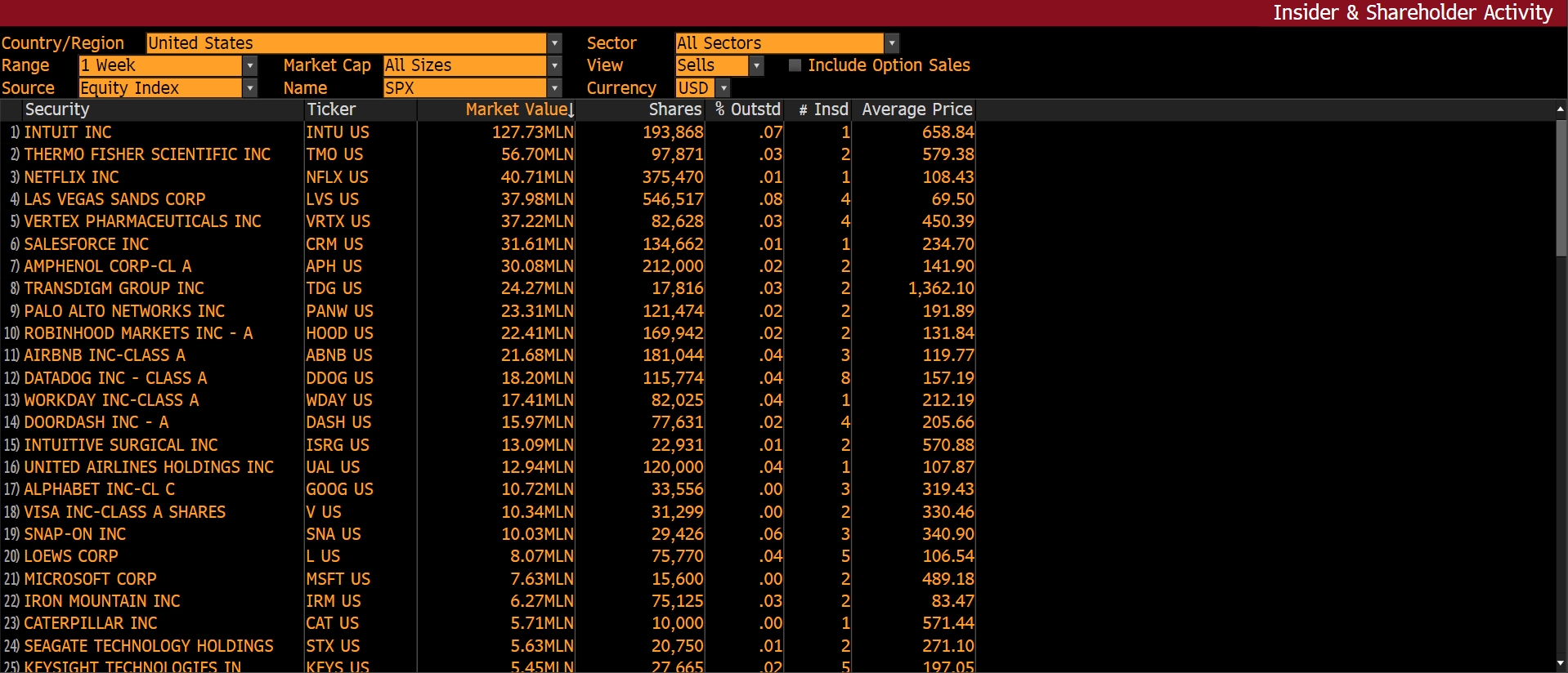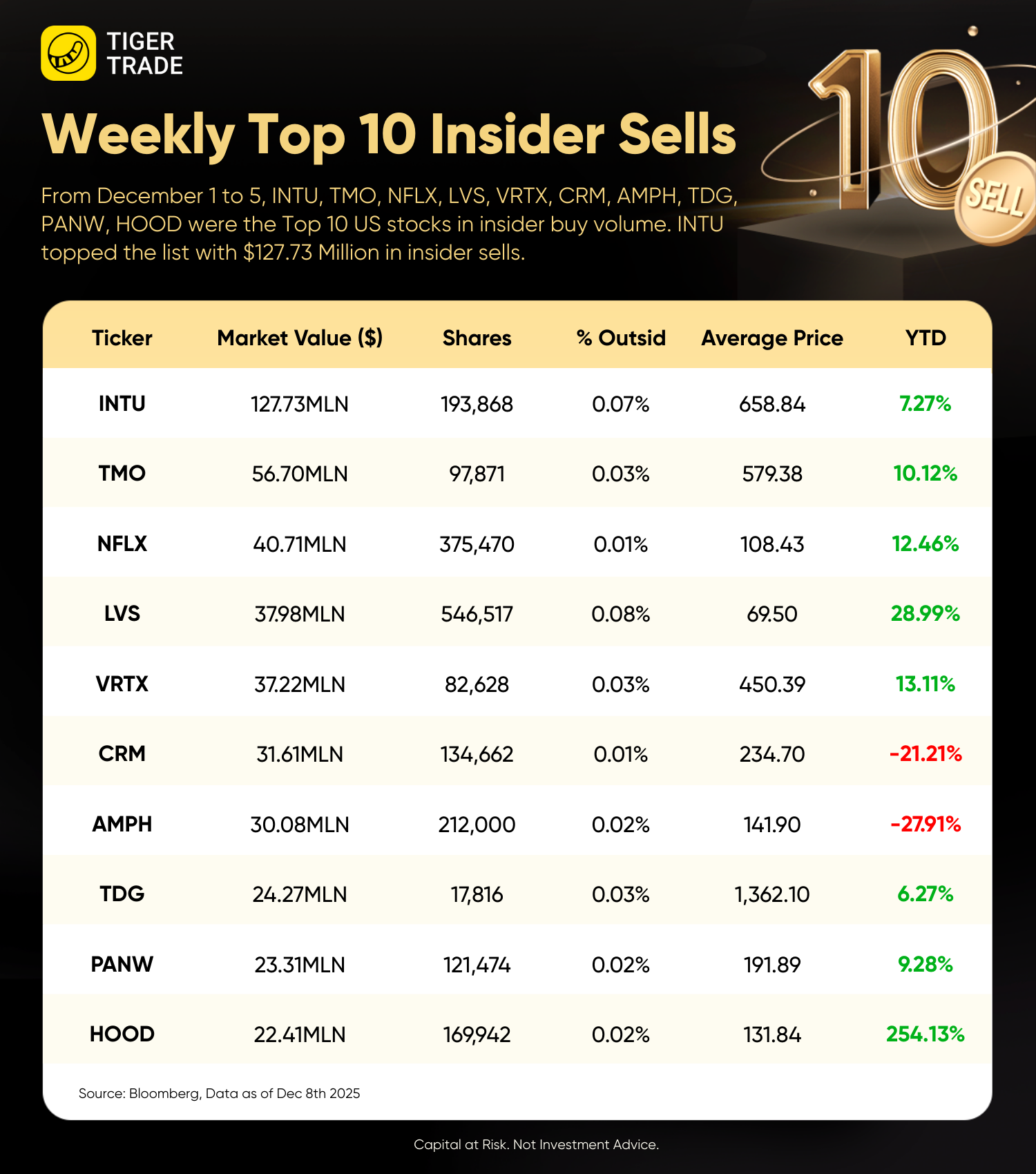 Firstly, the top 10 insider stock sales, ranked by amount, were $Intuit(INTU)$ $Thermo Fisher Scientific(TMO)$ $Netflix(NFLX)$ $Las Vegas Sands(LVS)$ $Vertex Pharmaceuticals(VRTX)$ $Salesforce.com(CRM)$ $Amphenol(APH)$ $TransDigm(TDG)$ $Palo Alto Networks(PANW)$ $Robinhood(HOOD)$
