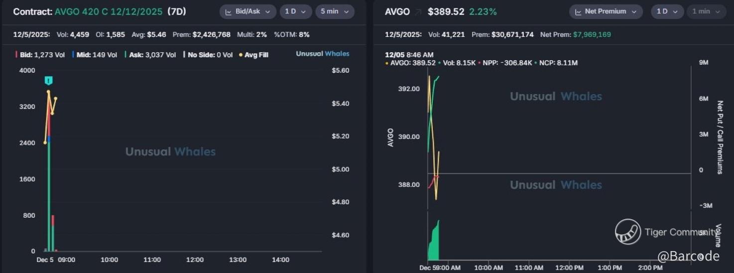 Institutional money loaded $2.43M in $AVGO 420C for next week, with 4,459 contracts traded and OI at 1,585. Net premium was $7.97M on 41,221 total options volume. That is not hedging. This is conviction and they are sizing for a volatility event.