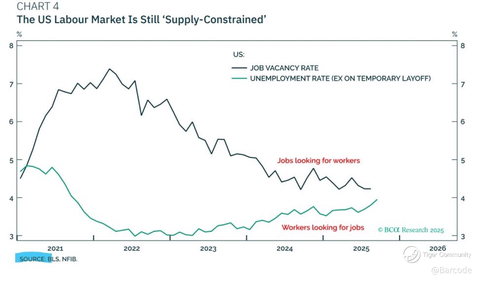 The core of the story sits in the labour market. Hiring has slowed sharply, but large scale layoffs still have not arrived. That is why unemployment has been rising at the slowest pace in modern history. The US labour market is still supply constrained. Job openings exceed the number of workers actively looking, and temporarily laid off workers are not counted because they are not searching. That gap is what keeps wage pressure sticky and inflation sticky. Powell cannot pivot aggressively while labour refuses to soften.