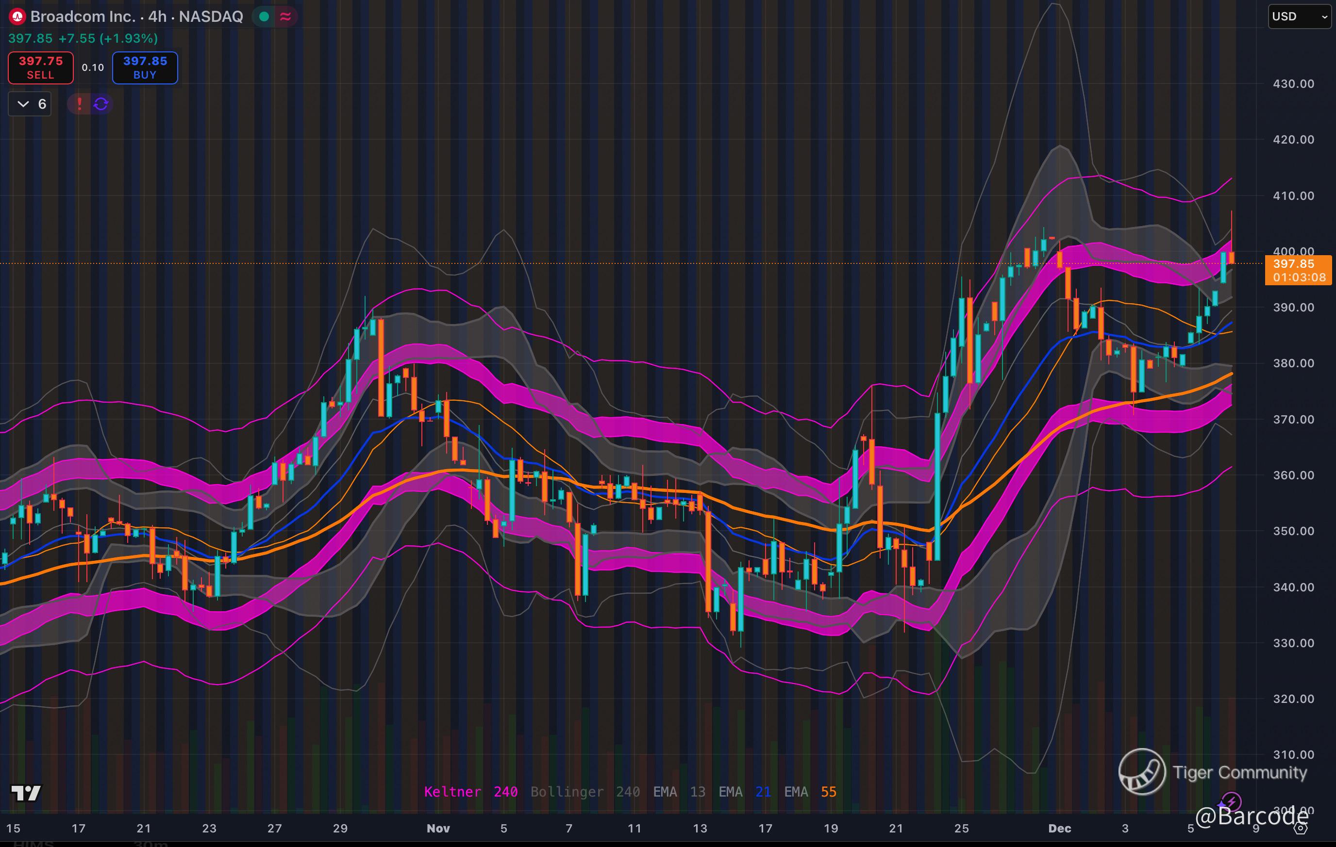 The chart confirms accumulation. Price reclaimed $390 and sits in the upper Keltner channel on the 4H with expanding Bollinger bandwidth. That creates short term upside, but also signals that expectations are elevated. If they beat and do not raise guidance, the stock can fade from perfection pricing.