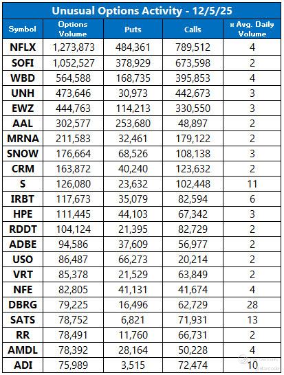 Friday’s options tape showed traders leaning into upside volatility: $NFLX, $SOFI and $WBD all printed 3 to 4 times normal volume. $CRM, $UNH, $MRNA and $EWZ saw bullish call activity. Outlier aggression in $SATS at 13 times, $ADI at 10 times and $DBRG at 6 times average activity. This is capital targeting opportunity while spreads remain tight and IV remains suppressed. That type of flow does not show up in bear markets.