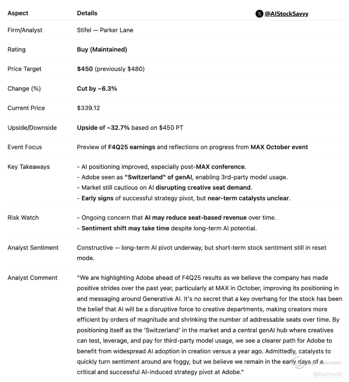 Stifel says Adobe is sharpening its generative AI messaging. Creative Cloud is now the indispensable editing layer sitting across third party models which reduces disruption risk. Stifel reiterates Buy and adjusts the price target to $450 as the Street wants proof of monetisation, not just demos.