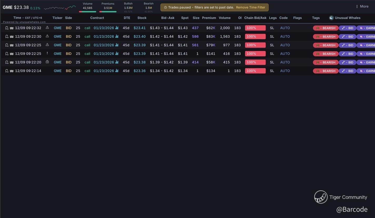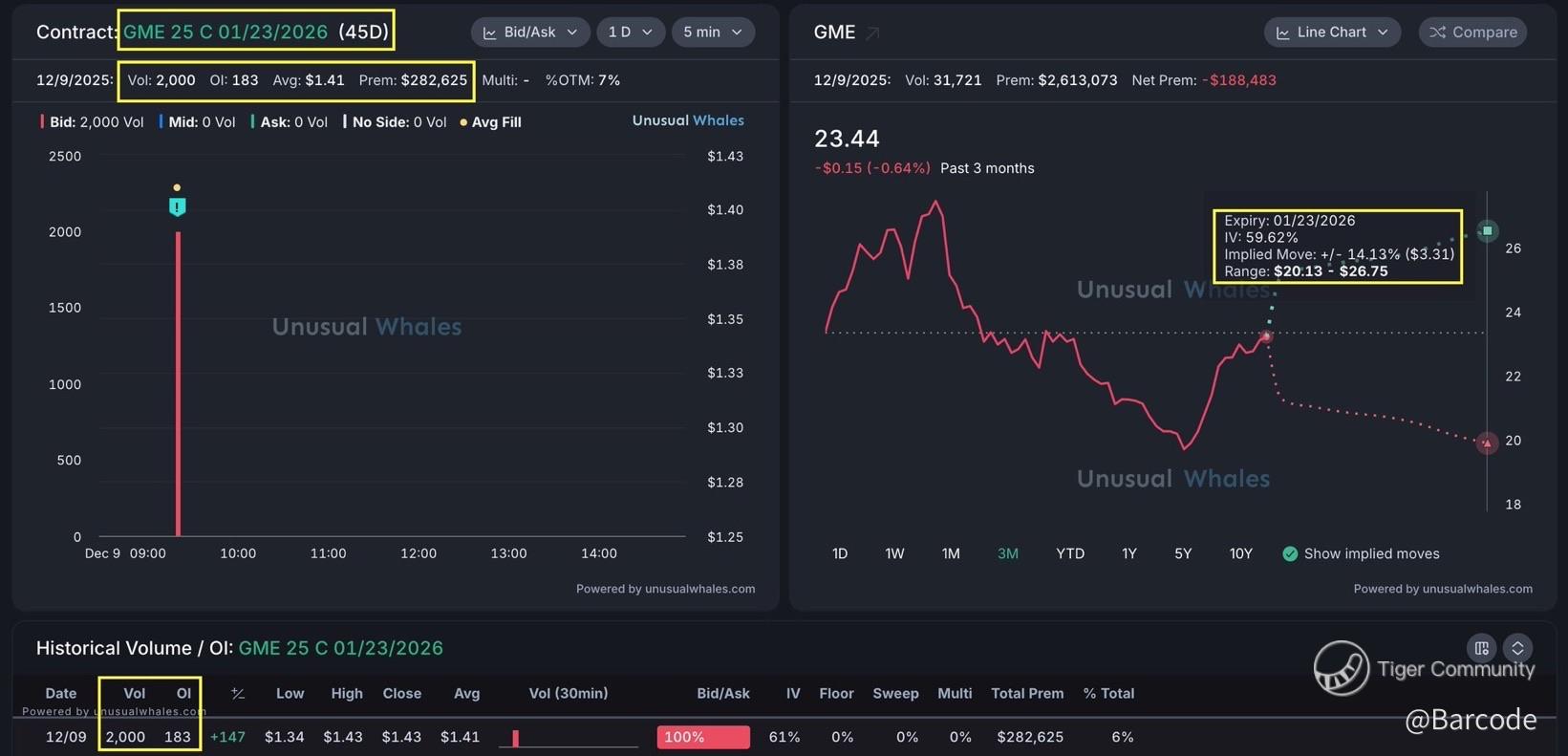 A trader sold 2,000 contracts of the $25 calls for 23 January 2026 expiry at $1.41 collecting $282,625 in premium. That equals 200,000 synthetic shares of overhead supply layered directly into breakout territory. Their breakeven is $26.41. Anything below $25 by expiry is maximum profit. This is not passive premium harvesting. This is a deliberate volatility lid into earnings.