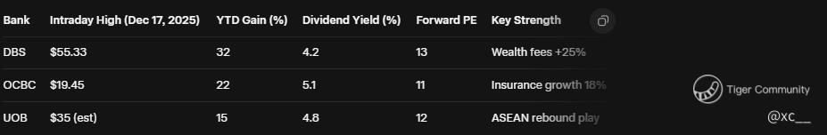 Singapore's banking giants are flexing hard today, with DBS hitting a fresh intraday high of $55.33 and OCBC peaking at $19.45 on December 17, 2025, riding a wave of robust wealth-management fees that jumped 25% in Q3 and solid capital-return strategies keeping investors hooked. π These moves aren't random β they're backed by resilient business models that shrug off falling interest rates, with wealth inflows offsetting NIM squeezes and dividend yields clocking 5%-6% into 2026 for that reliable cash flow drip. Buybacks are cranking too, propping up shares amid global jitters, turning these banks into quiet compounders that stack gains without the drama of tech swings. π