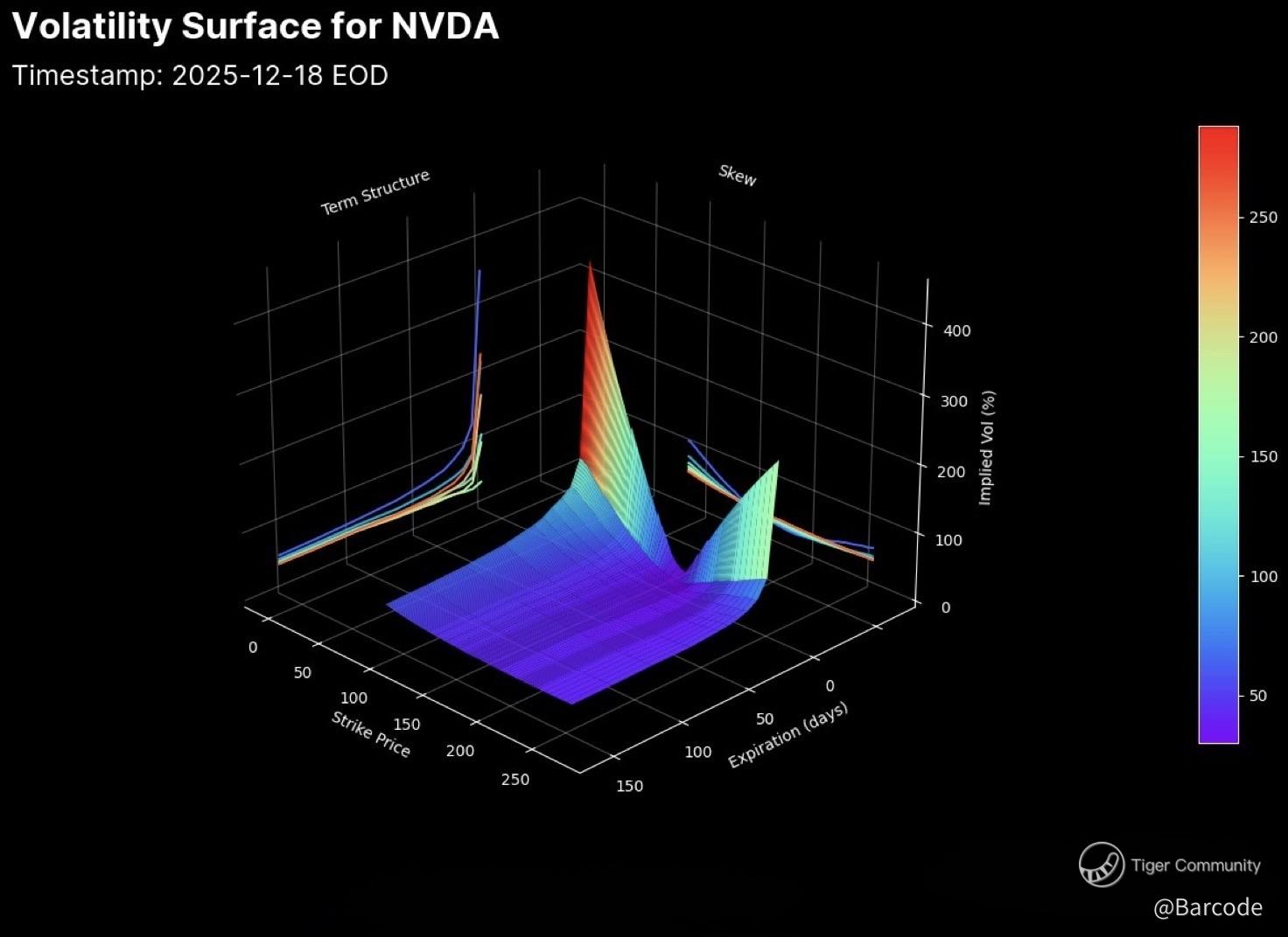 Iβm watching $NVDAβs volatility surface closely. Near-term implied volatility remains compressed and the vol smile has flattened materially. Short-dated expiries are pricing smaller realised moves than earlier in the year, which is consistent with heavy dealer gamma and expiry pinning rather than genuine complacency. Importantly, deep OTM options remain structurally expensive, telling me tail risk is still being respected. Calm expectations for now, but convexity is not being handed out cheaply.