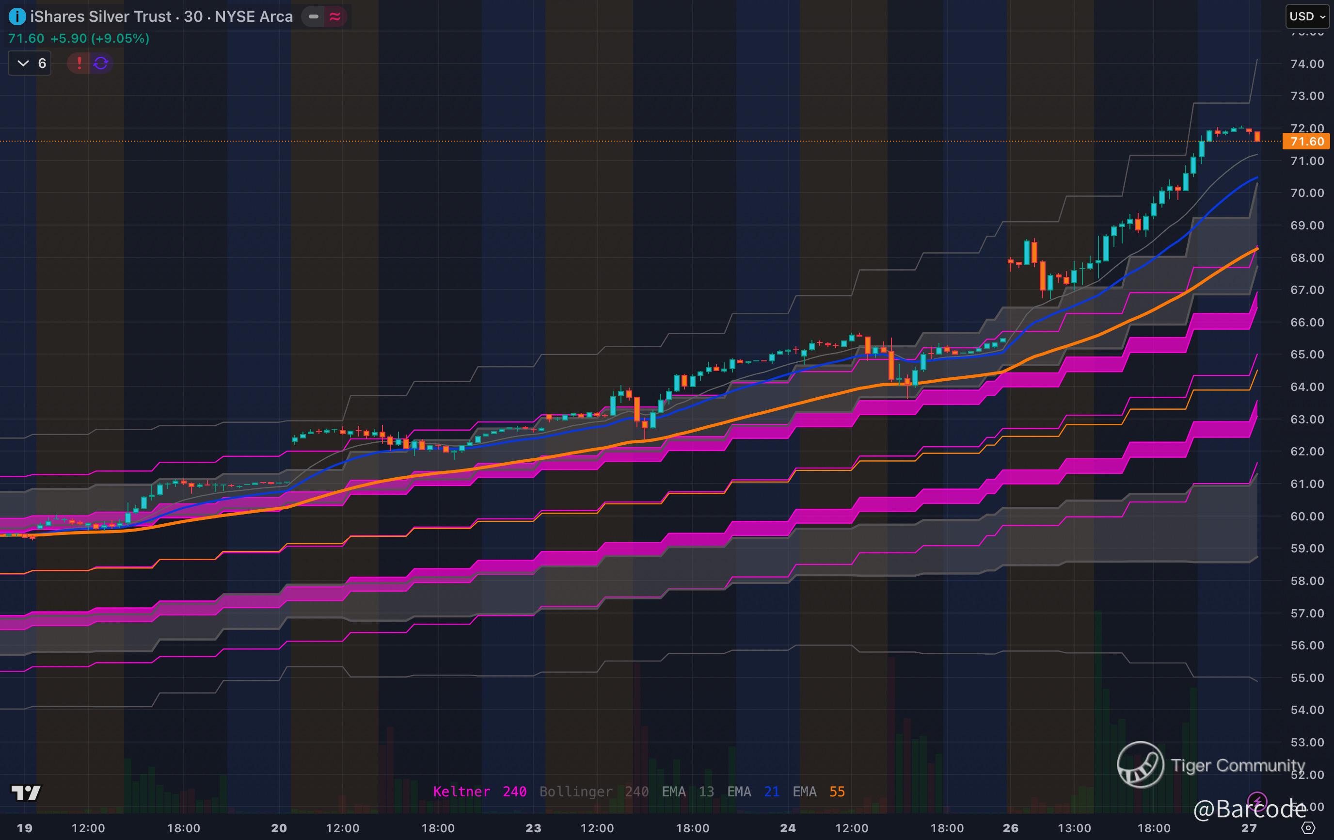 //@Barcode:$iShares Silver Trust(SLV)$ Silver futures flipped from roughly +6% to about -2% on the session, an 8% intraday reversal, right into the $SLV Fibonacci extension I mapped out in the post at 0726. That’s classic parabolic behaviour, volatility expands first, then price snaps back to test structure.