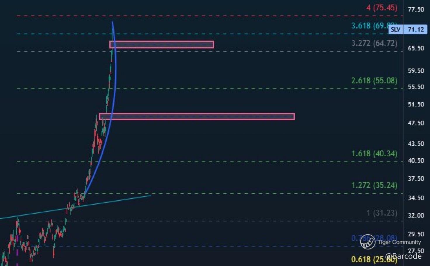 $iShares Silver Trust(SLV)$ Silver futures flipped from roughly +6% to about -2% on the session, an 8% intraday reversal, right into the $SLV Fibonacci extension I mapped out in the post at 0726. That’s classic parabolic behaviour, volatility expands first, then price snaps back to test structure.