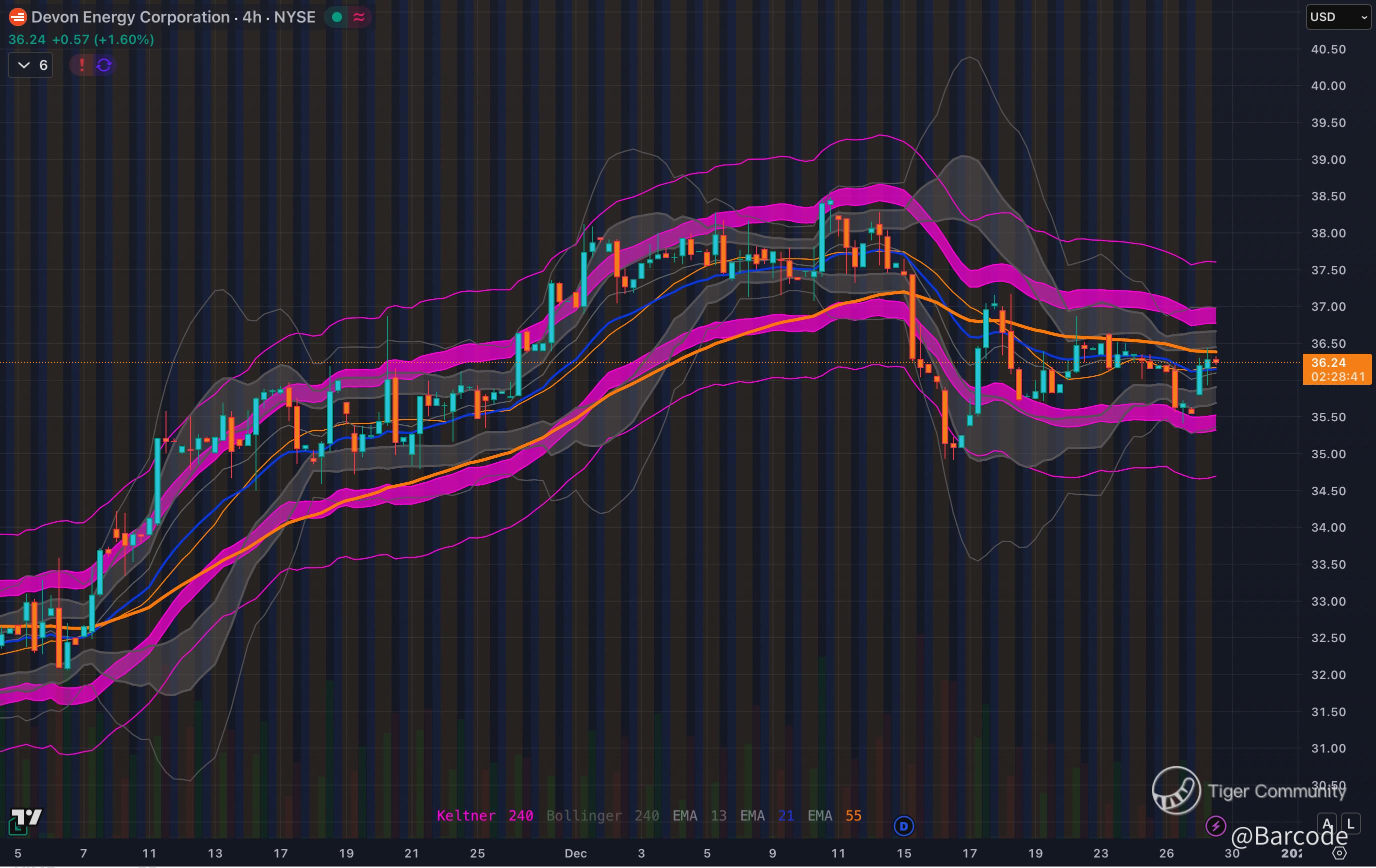 On the 4H chart, DVN is holding in the upper half of its Keltner channel and repeatedly defending the mid band on shallow pullbacks. The EMA stack remains constructive, with the 13 and 21 EMA holding above the 55 EMA, signalling trend continuation rather than exhaustion. Bollinger bands are beginning to re-expand after prior compression, highlighting rising resolution risk.