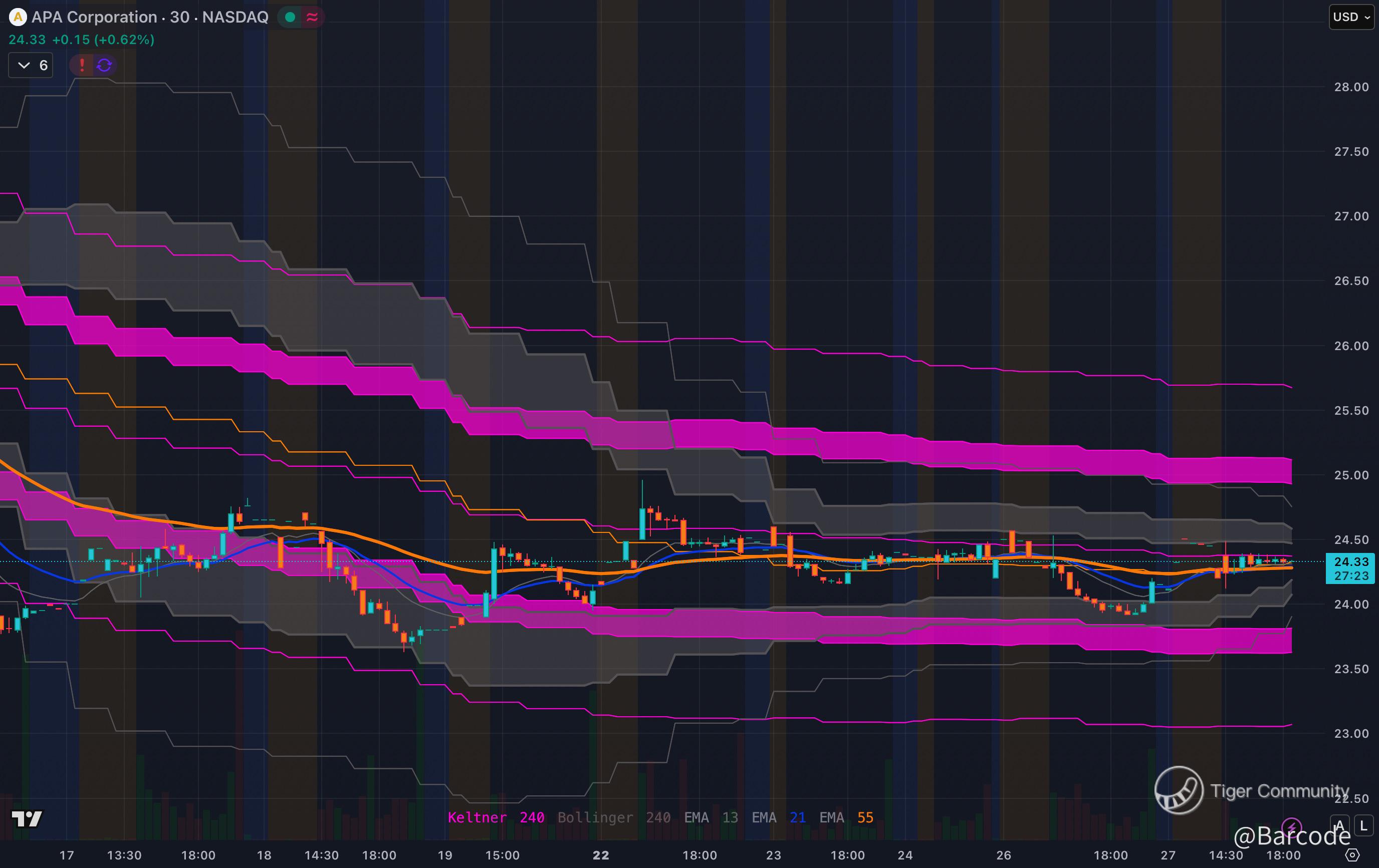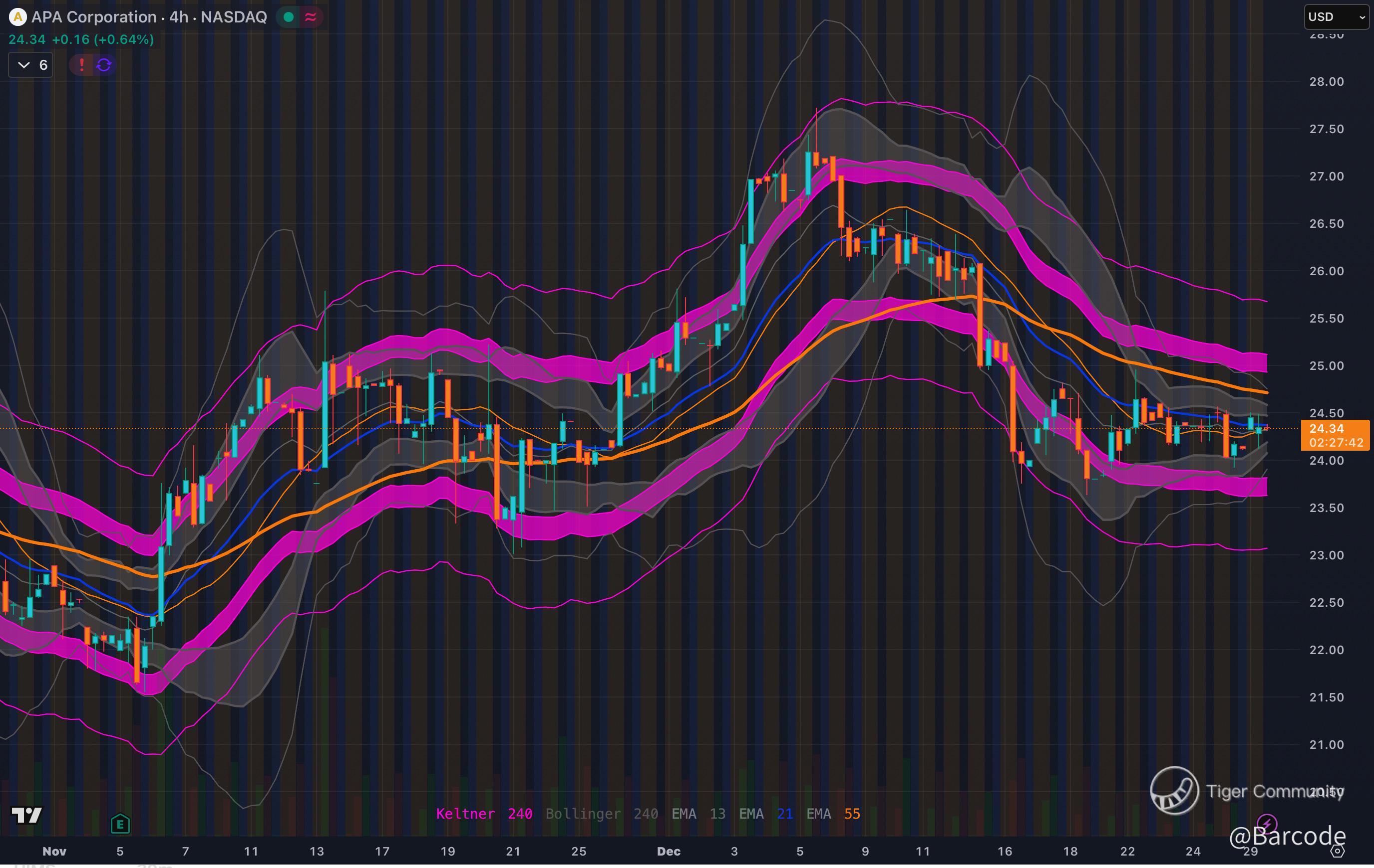 After pulling back from December highs, price has stabilised and is holding its 80-day moving average near $24. On both the 4H and 30-minute charts, price is compressing tightly within the Keltner bands, with Bollinger volatility contracting again after the prior downside impulse. That suggests absorption rather than extension.