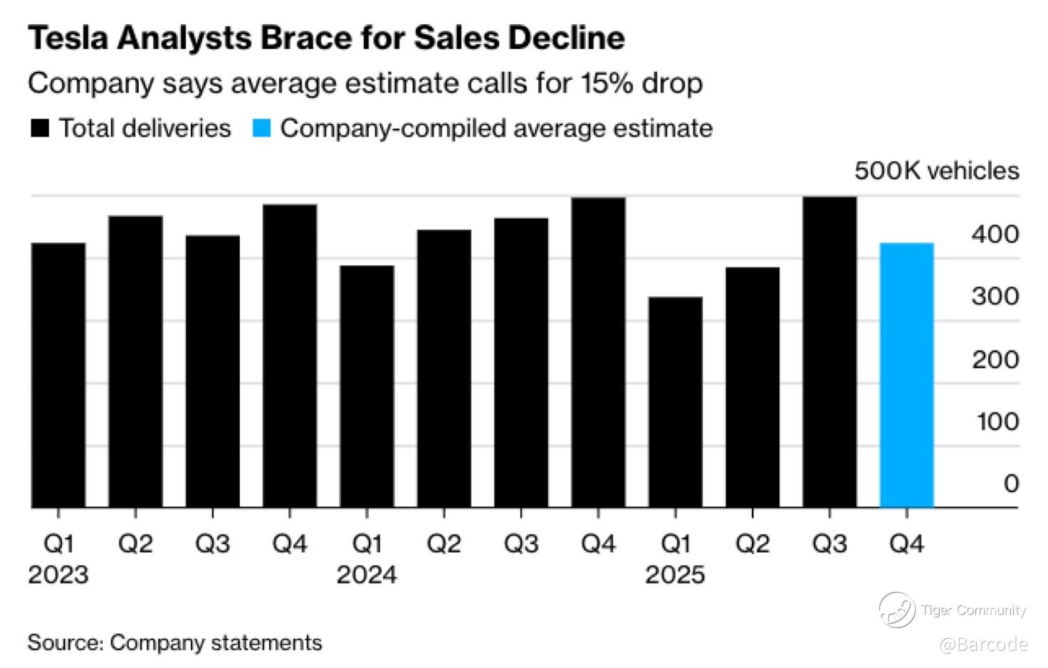 $TSLA Q4 deliveries are expected around ~423k, roughly -15% QoQ, setting up a potential first annual decline as competition, rates, and China headwinds weigh ahead of the 02Jan results.