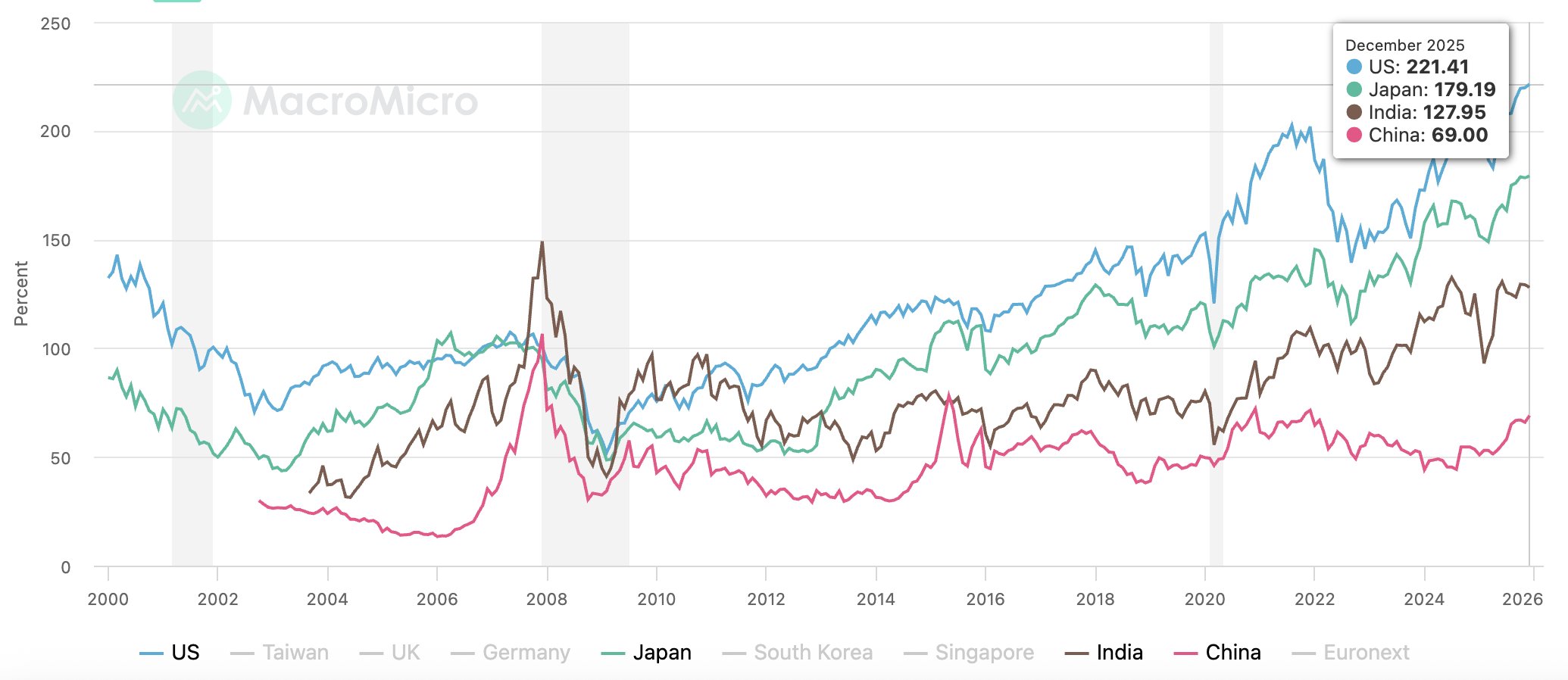 Still one of the cheapest major global markets, China's total market capitalization relative to its GDP is just half that of India, and 1/3rd that of Japan.