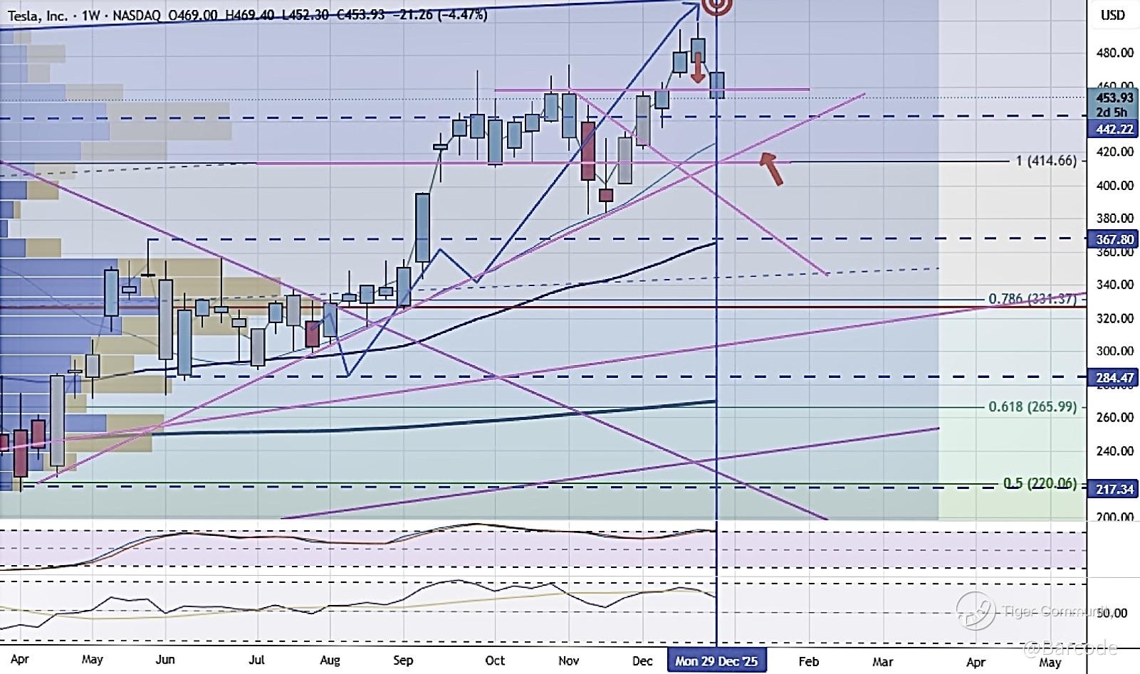 $TSLA hit its upside target and failed; that rejection points to a likely test of the lower UTL, as marked by the lower arrow, while the broader trend remains bullish longer term.