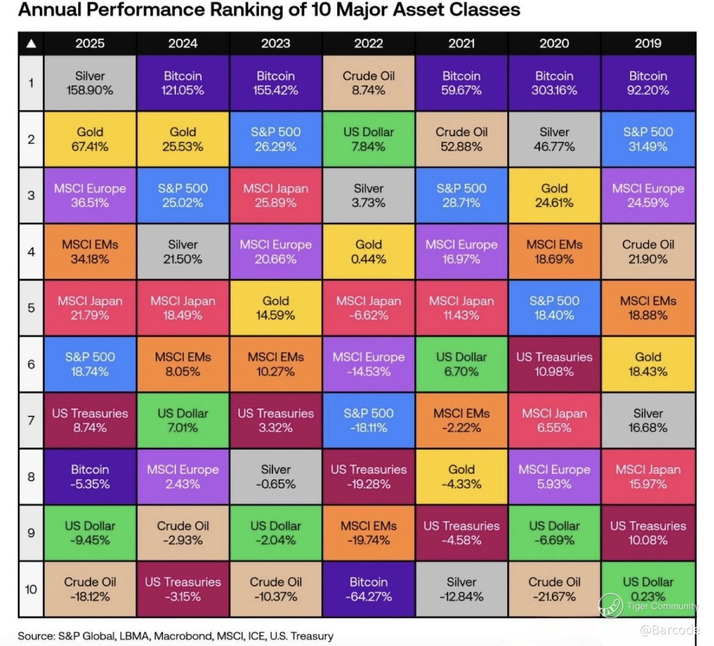 The broader annual performance ranking reinforces it. In 2025, Silver and Gold topped the major asset class leaderboard, followed by MSCI Europe and MSCI EMs. The S&P 500 delivered solid mid-teens gains, while Bitcoin, the US dollar, and crude oil finished near the bottom. Directionally, the message is clear; real assets mattered.